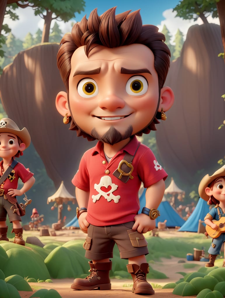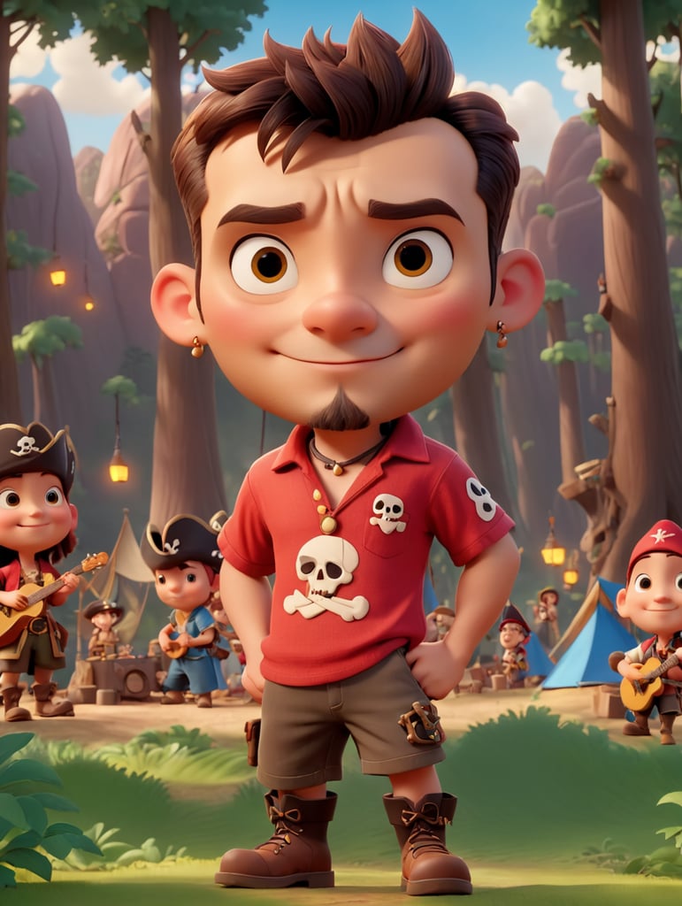 - adorable pirate camping in the woods wild rock concert pirate adventure woodsy excursion imaginary landscape nature’s hideaway musical fusion distant view wilderness melody