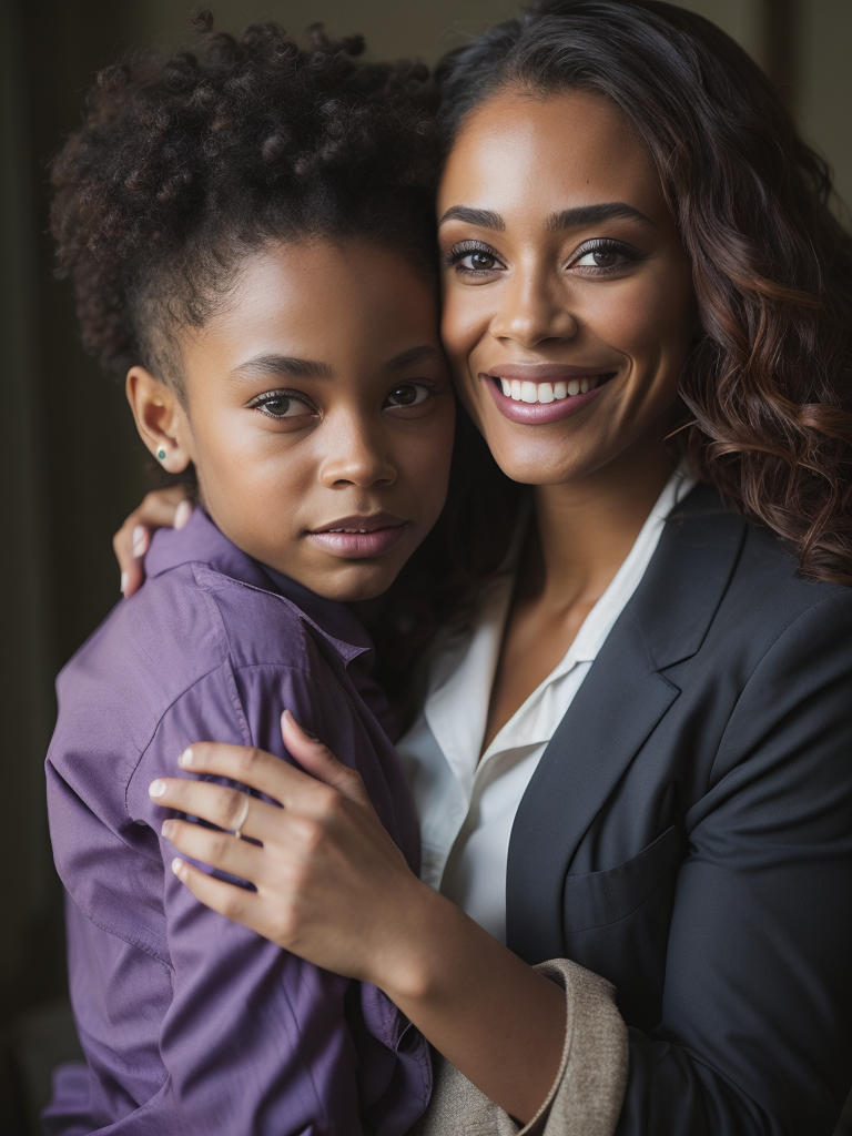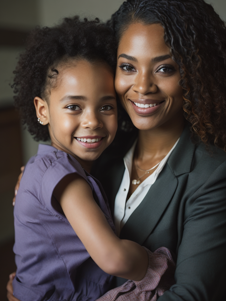African-american woman smiling, hugging granddaughter, highly detailed, sharp focus, dramatic lighting, depth of field, blurred light color background
