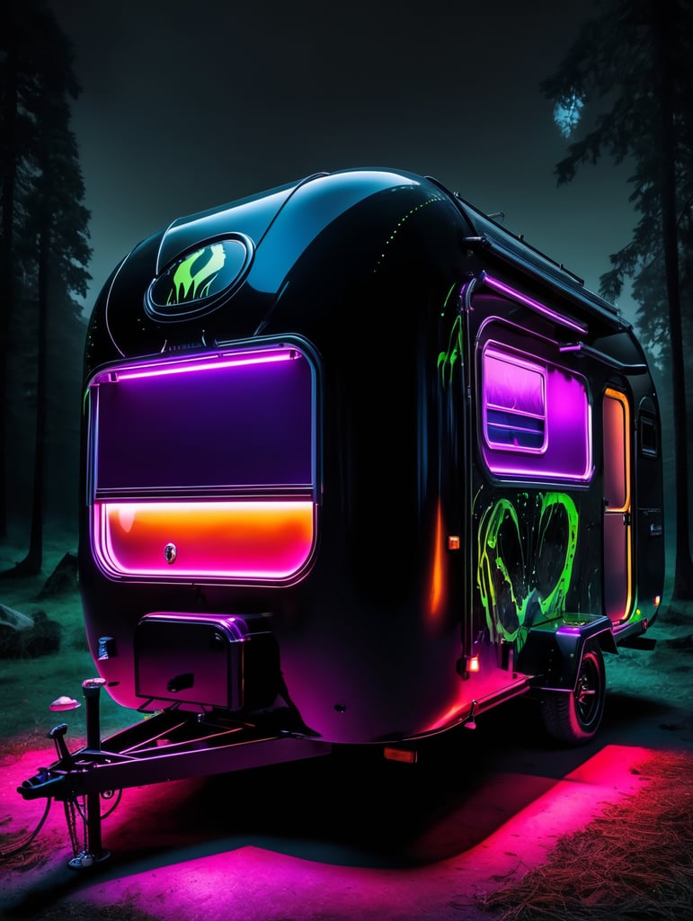 Alien camping trailer made of black alien liquid, translucent with neon lights, liquid dripping from the trailer, dark atmospherehttps://lumenor.ai/terms-of-service/https://lumenor.ai/ai-generated-images-gallery/hq57LEROXh/lumenor AIlumenor AI