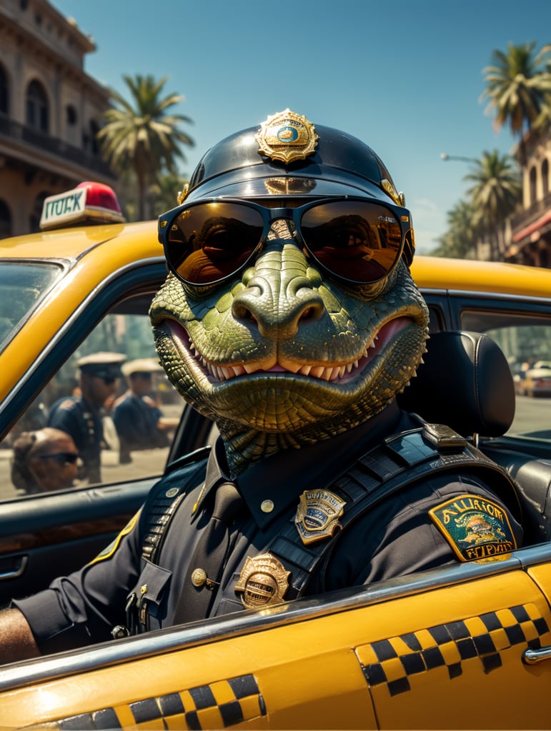 Alligator police officer, sitting behind the wheel of a taxi, close-up shot, sunglasses, clipart, stock photo