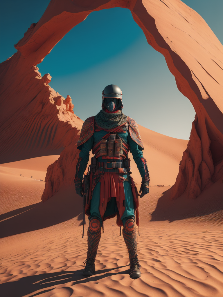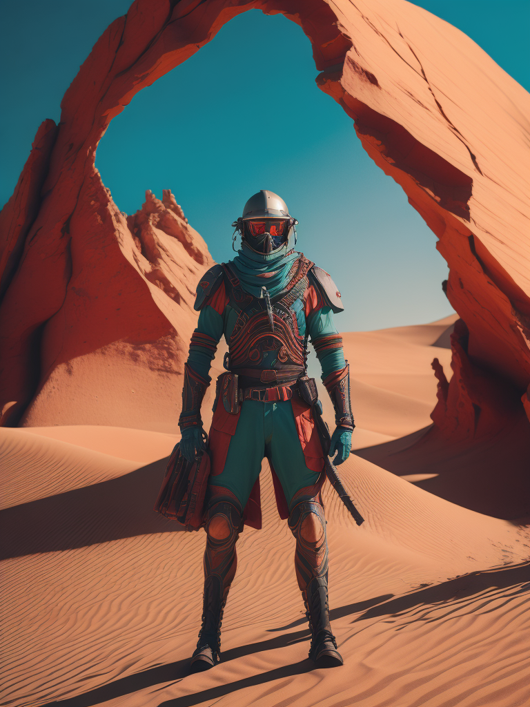 anaglyph-2D Devotion surreal life, full body of a sand raiders man, backdrop is desert, warm color palette, illustration, John Henry Alvin