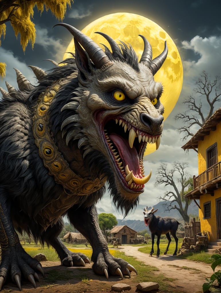 - anthropomorphic chupacabra cryptid vicious teeth long fangs eating a goat elongated yellow eyes short dark fur mane like spines mexican farm house full moon