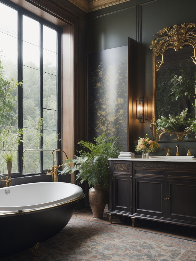 Architectural digest photo of a maximalist bathroom living room with lots of flowers and plants, golden light, award winning masterpiece with incredible details big windows, highly detailed, harper's bazaar art, fashion magazine, sharp focus