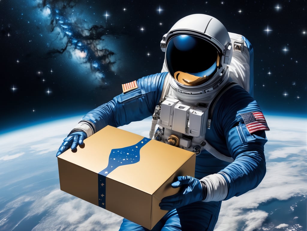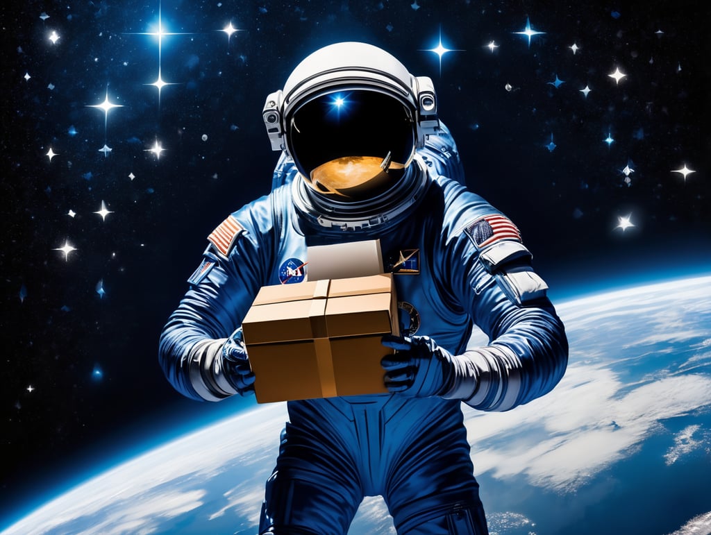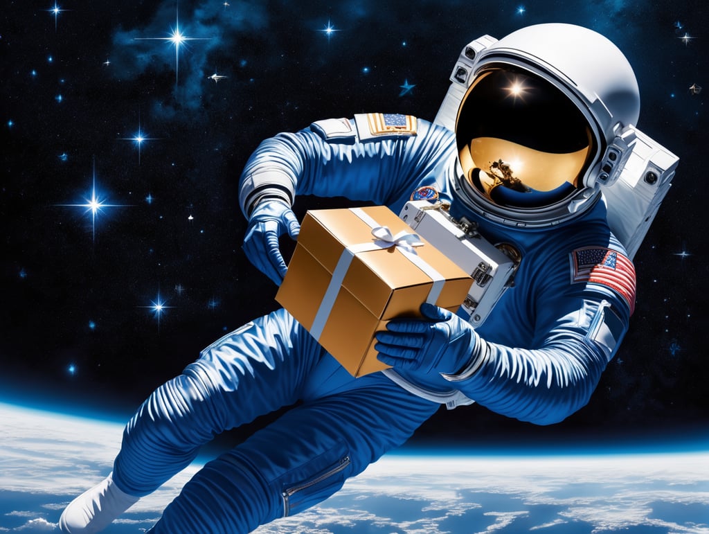An astronaut floating in space holding a box in deep space. Floating in dark space with just small stars, pitch black. Shiny blue astronaut suit.