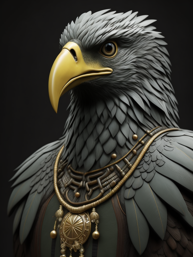 Aztec era, Xiuhtecuhtli marble sculpture, Aztec style noble eagle, cool jade and deep obsidian style, masterfully carved parts, black background, green marble, sharp highlights, contrasting light, deep colors