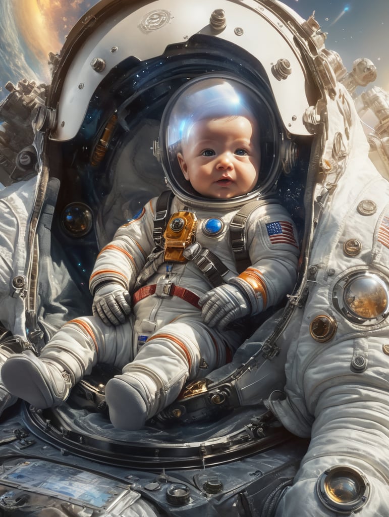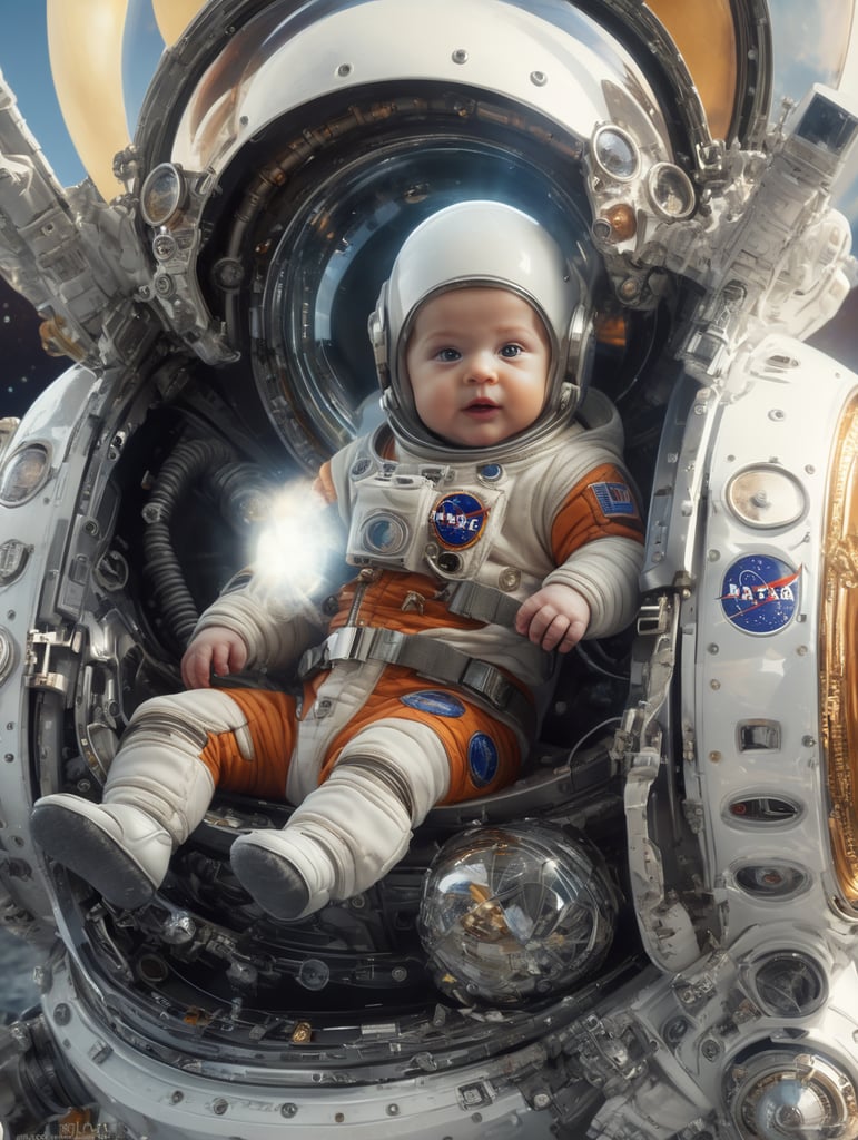baby astronaut, 4k, lightfilm, sunlight in glass, realistic, realism