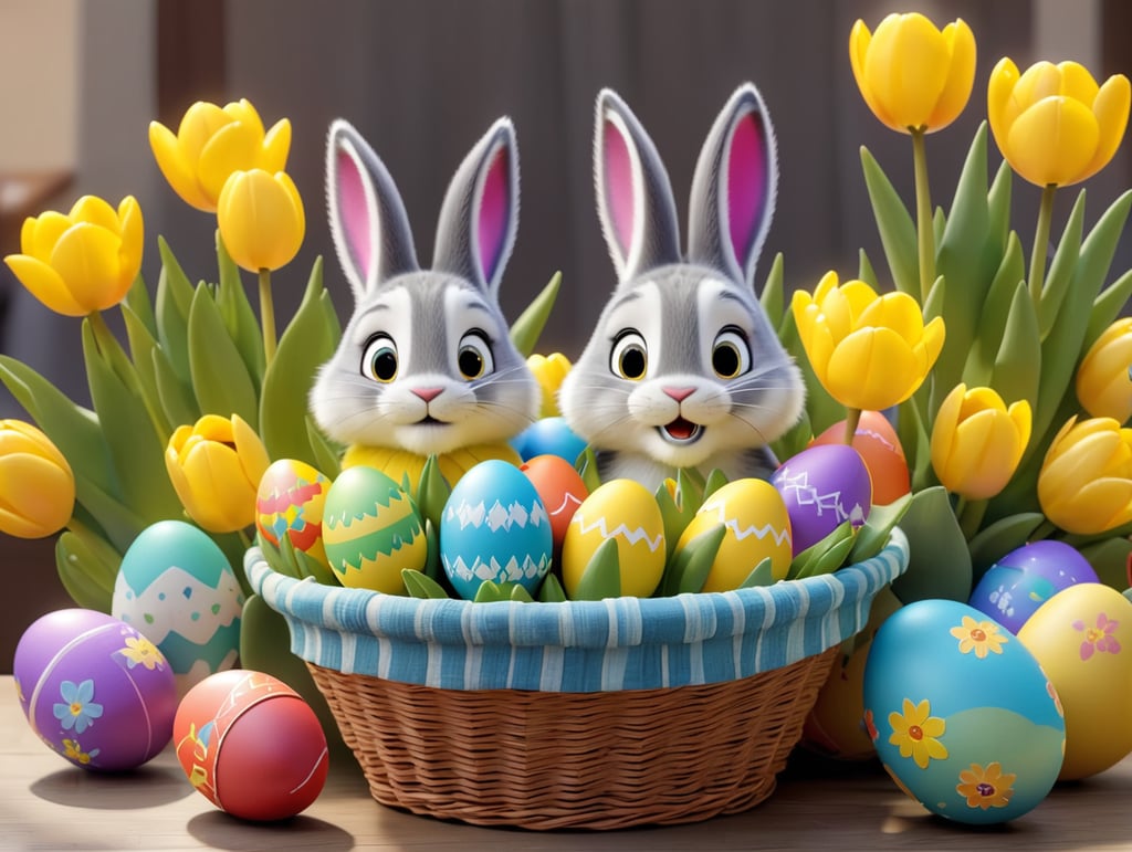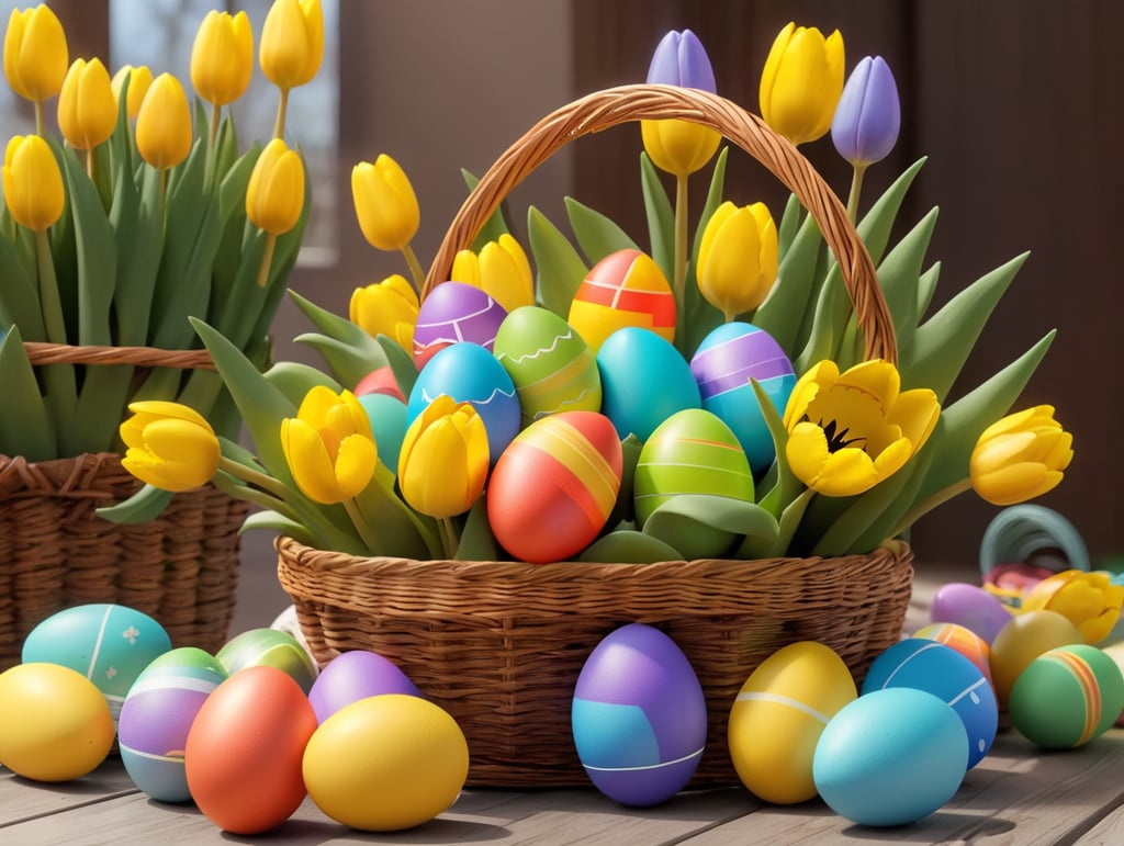 - easter basket colorful eggs yellow tulips easter decorations spring celebration festive floral arrangement seasonal bouquet easter traditions vibrant colors springtime joy