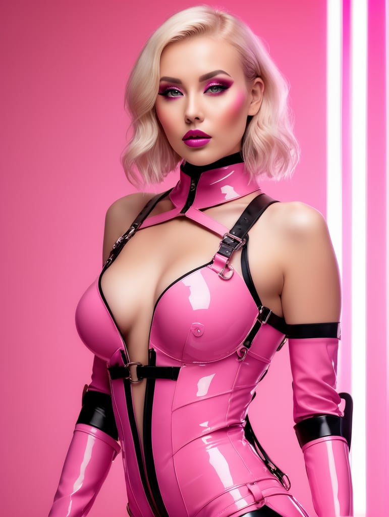 A beautiful blonde female all pink sleek futuristic harness,latex boots, clean makeup, with depth of field, fantastical edgy and regal themed outfit, captured in vivid colors, embodying the essence of fantasy, minimalist
