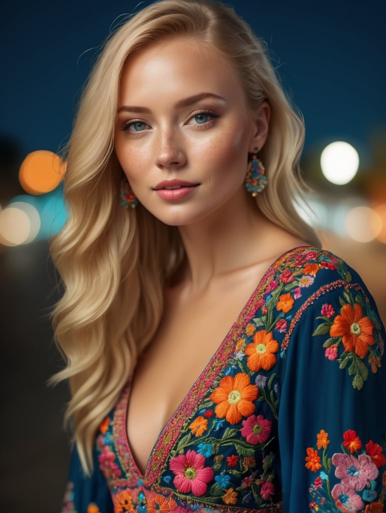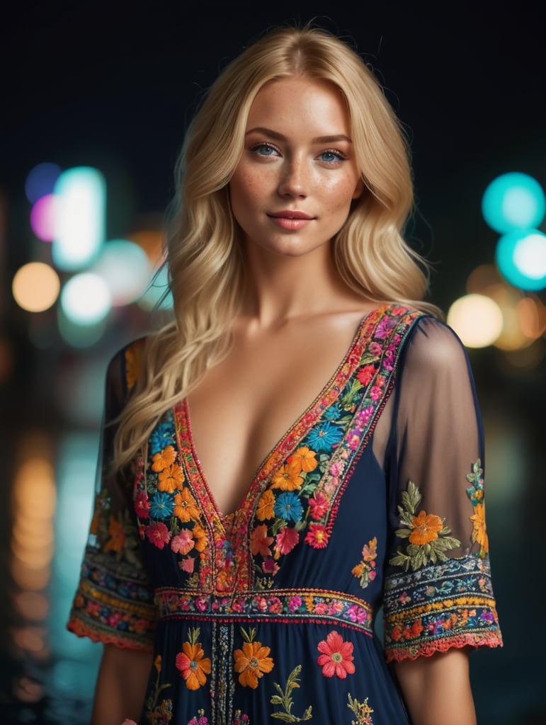 Beautiful blonde woman with freckles, wearing a colorful, vibrant, detailed embroidered dress, medium-full shot, at night