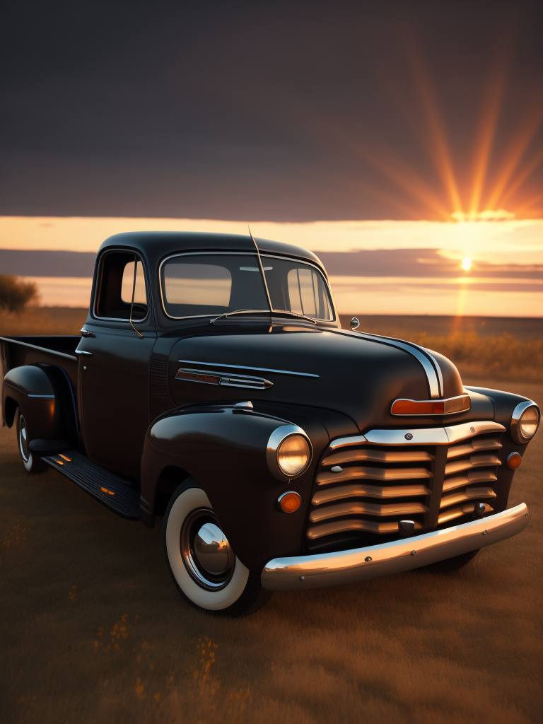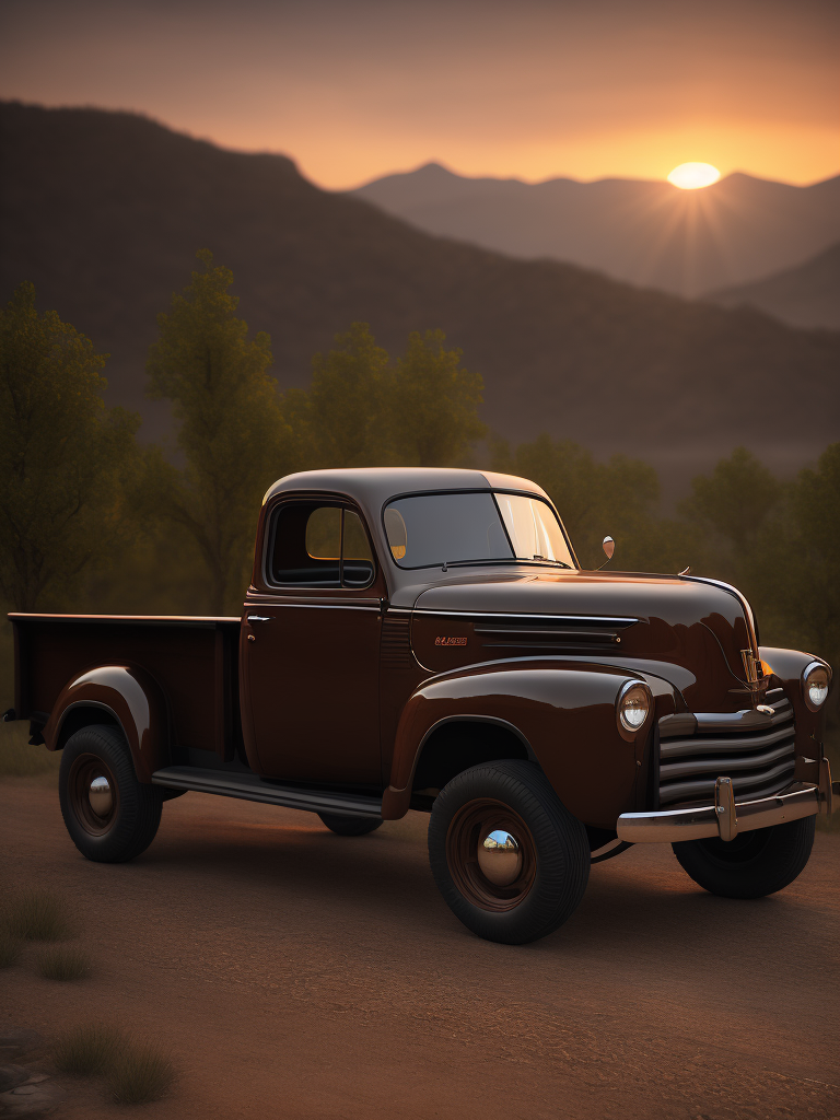 beautiful old pickup at sunset volumetric light, detailed, sharp focus, highly detailed,