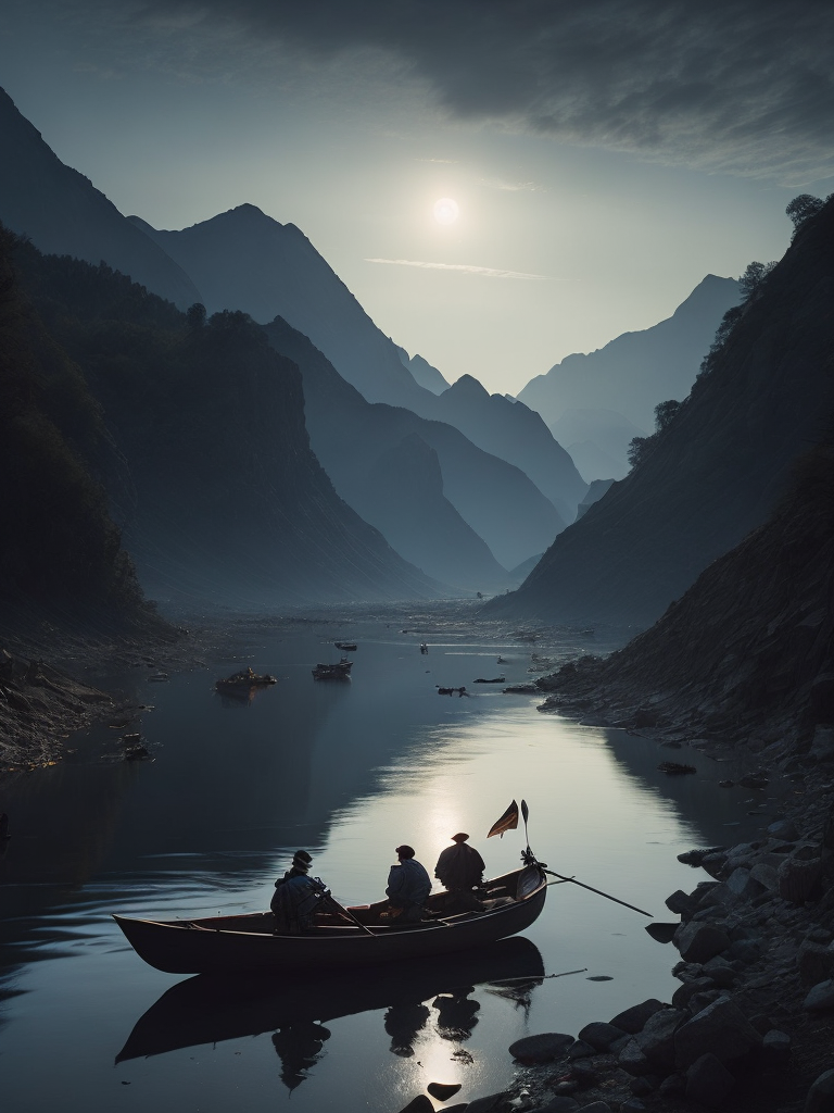 A beautiful river on the moon at dusk. the river is flowing across the moon mountain and a boatman is rowing a boat on the river. the earth is visible in the sky. hyper realistic, real, detailed, exact descriptions.https://lumenor.ai/terms-of-service/https://lumenor.ai/ai-generated-images-gallery/BrwfIpatD/lumenor AIlumenor AI
