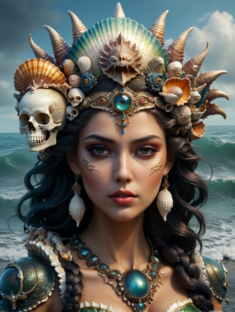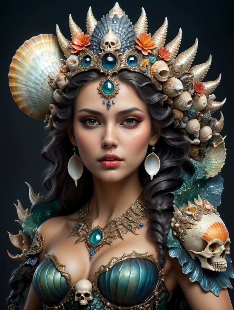 - beautiful siren seashell crown cheek scales three quarter view bust portrait human skull mythical creature enchanting beauty eerie gaze ocean inspired