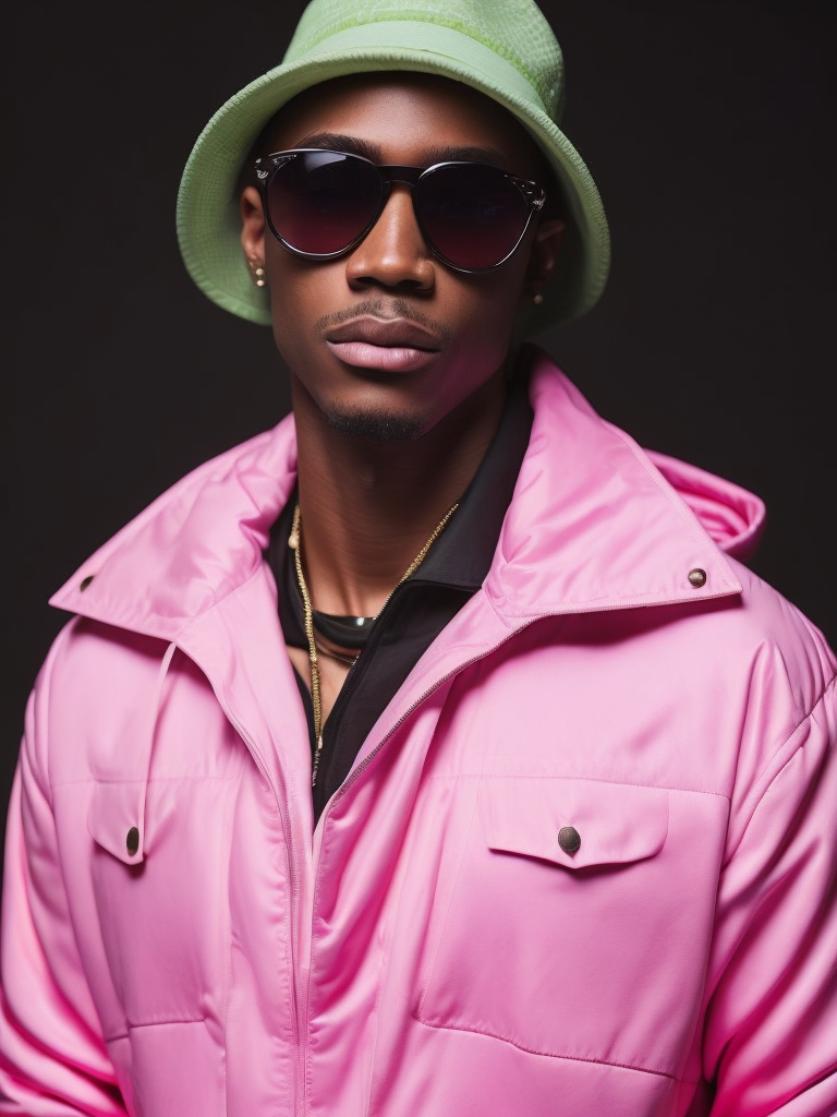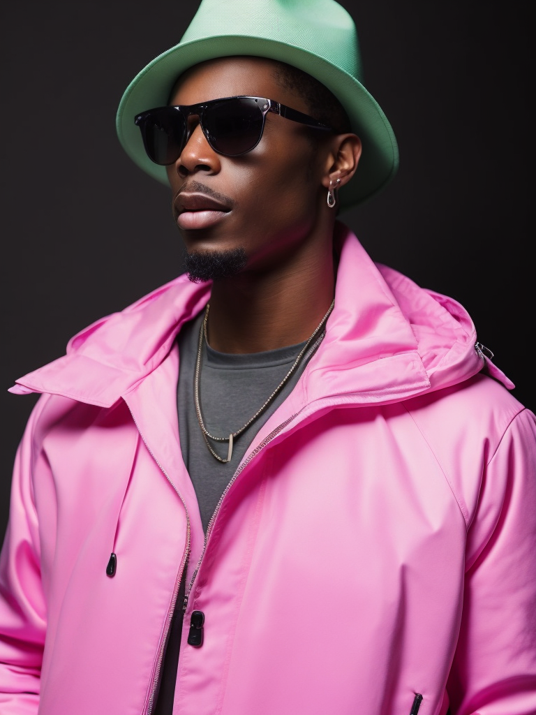 Black male fashion model, Wearing a pink jacket and a green panama hat, large black sunglasses, Black background, Bright and rich colors, bright saturated color, sharp focus,