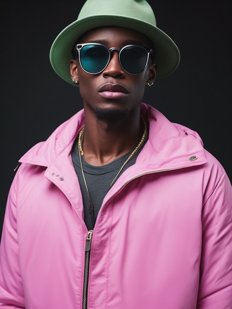 Black male fashion model, Wearing a pink jacket and a green panama hat, large black sunglasses, Black background, Bright and rich colors, bright saturated color, sharp focus,https://lumenor.ai/terms-of-service/https://lumenor.ai/ai-generated-images-gallery/hB43uhLgDh/lumenor AIlumenor AI