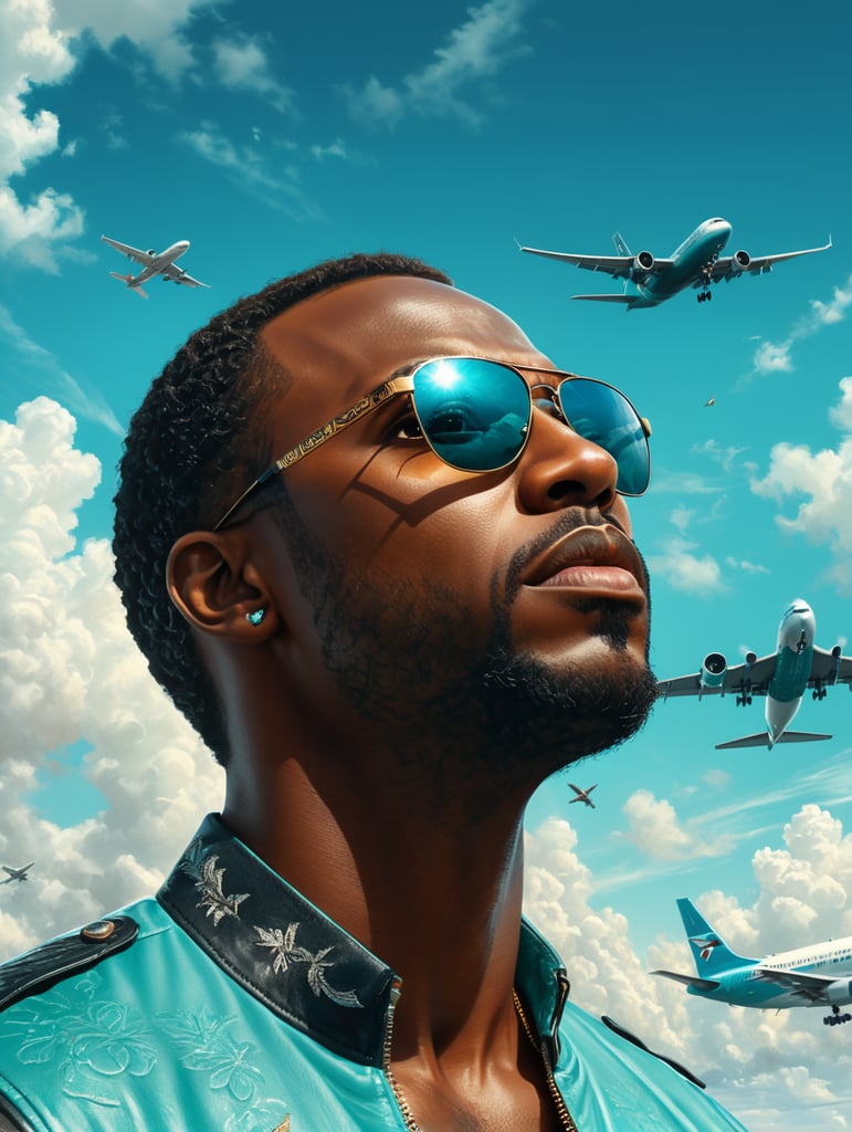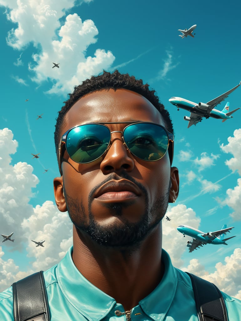 a black man raised his head up, looks at the sky, sunglasses, an airplane flies in a clear sky and leaves a mark, summer, turquoise shades, vector arthttps://lumenor.ai/terms-of-service/https://lumenor.ai/ai-generated-images-gallery/h3Kw0FZ2jg/lumenor AIlumenor AI