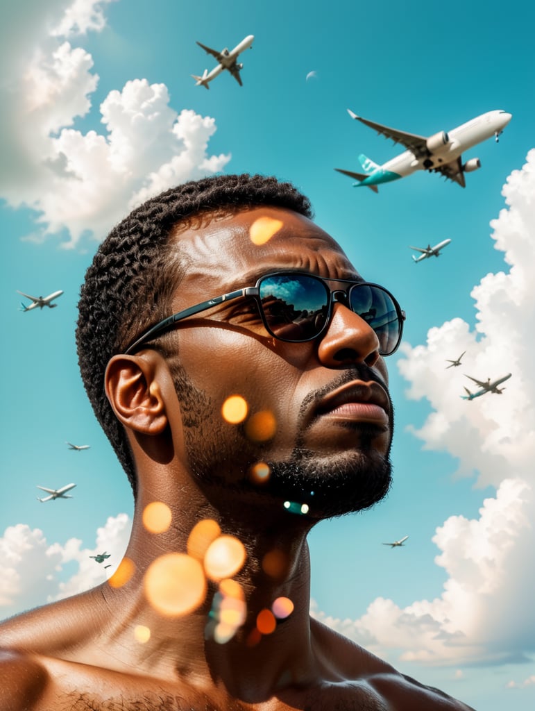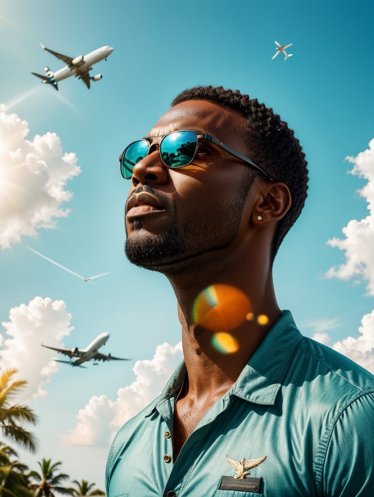 a black man raised his head up, looks at the sky, sunglasses, an airplane flies in a clear sky and leaves a mark, summer, turquoise shades, vector art