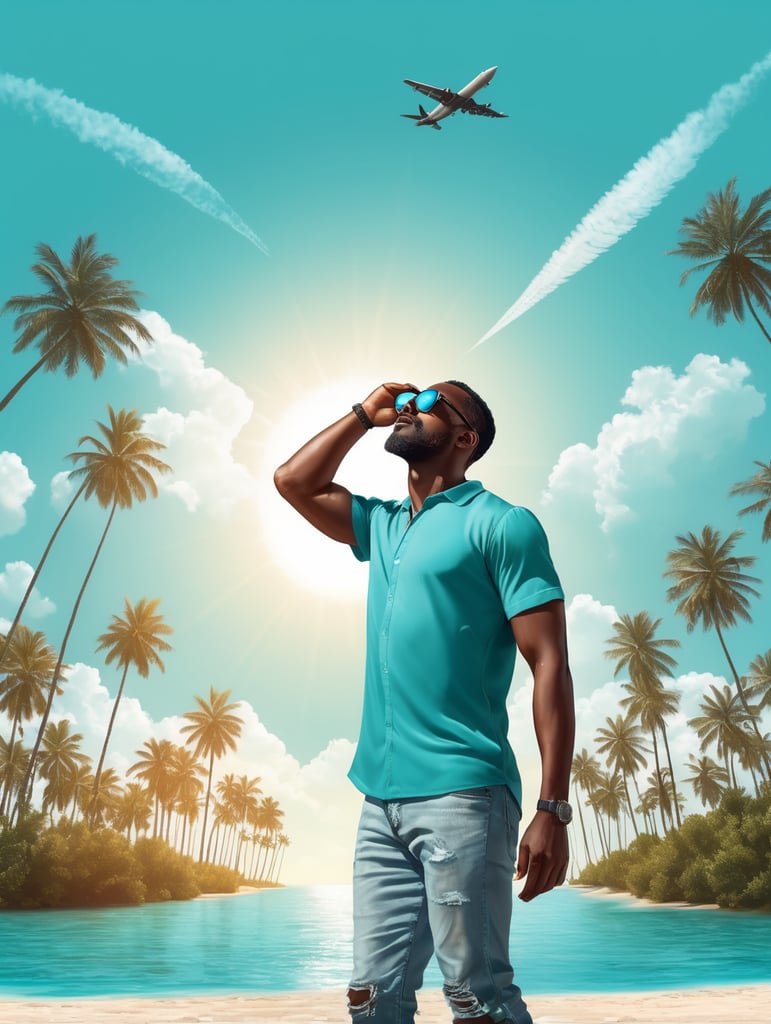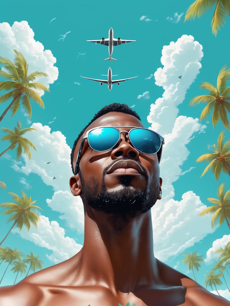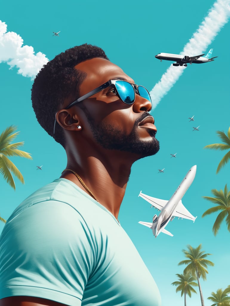 a black man raised his head up, looks at the sky, sunglasses, an airplane flies in a clear sky and leaves a mark, summer, turquoise shades, vector arthttps://lumenor.ai/terms-of-service/https://lumenor.ai/ai-generated-images-gallery/h3KwtDfIVK/lumenor AIlumenor AI