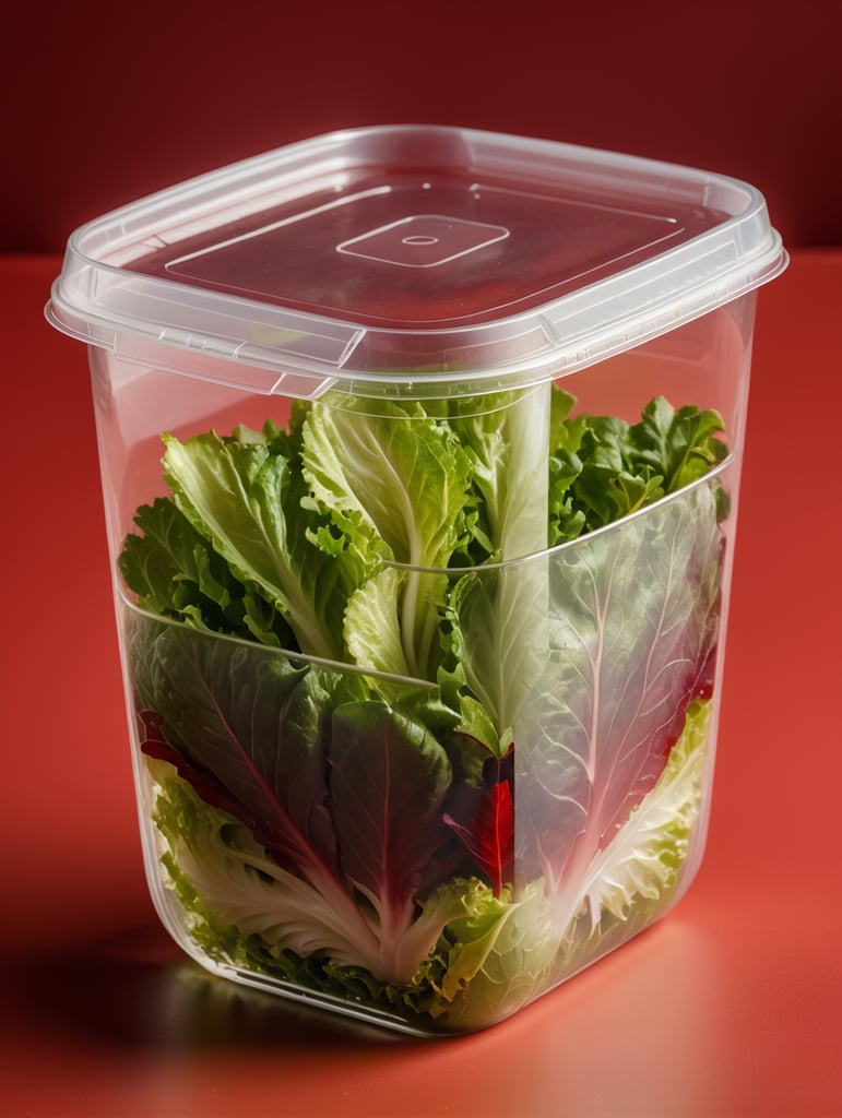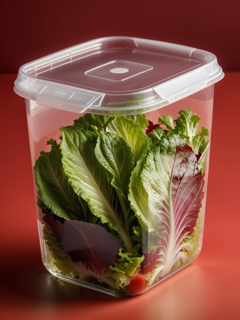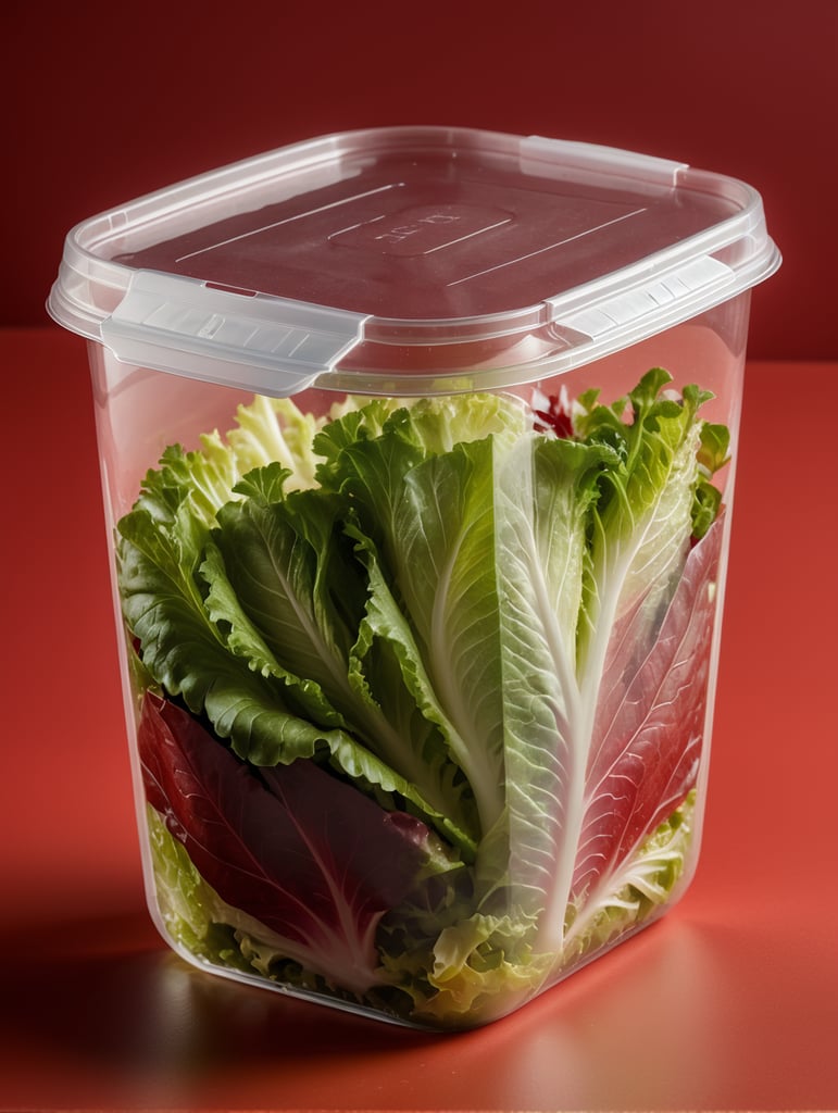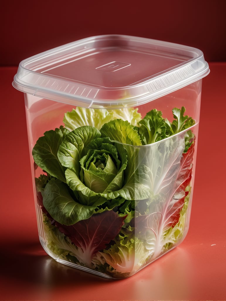 blank Transparent Plastic Container with Iceberg lettuce Salad, isolated, red background, Mockup, mock up