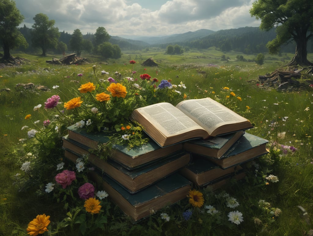 - text to image flowers books messy green meadow nature growth floral scenic background botanical