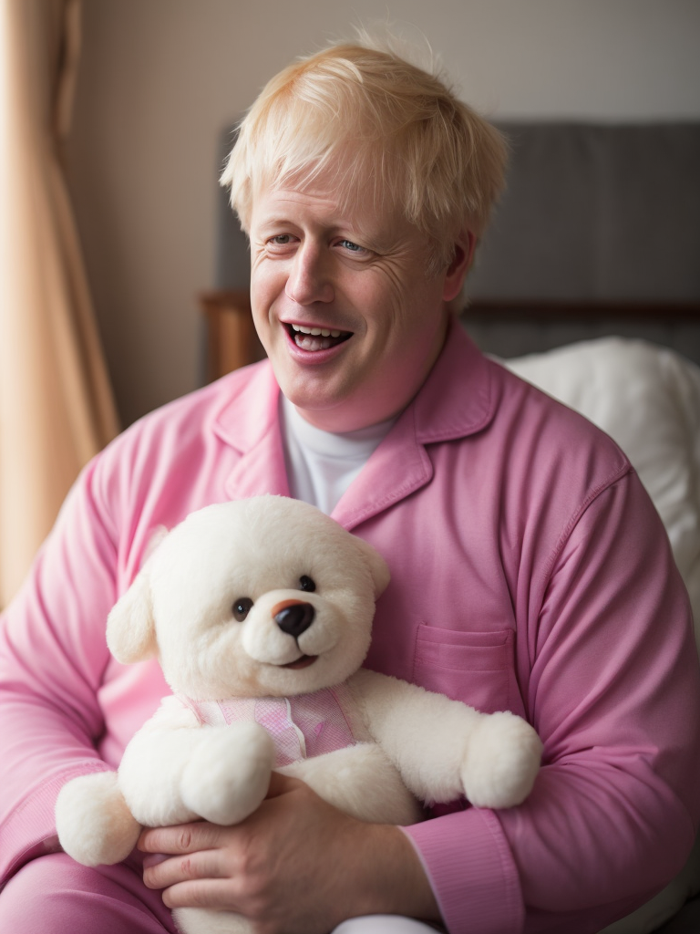 - boris johnson pink pajamas laughing cute toy bright colors saturated colors detailed portrait realistic style british politician humorous depiction