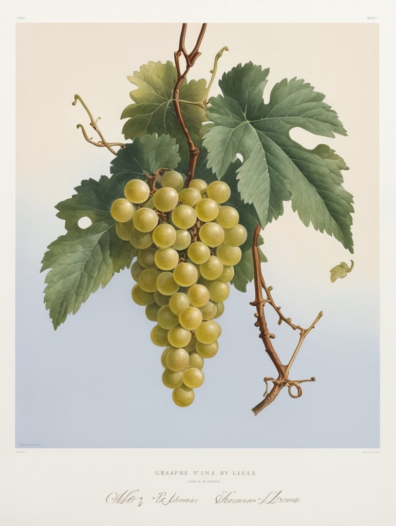 Botanical illustration print. grapes on vine with leaves. by Pierre-Joseph Redouté. on white background