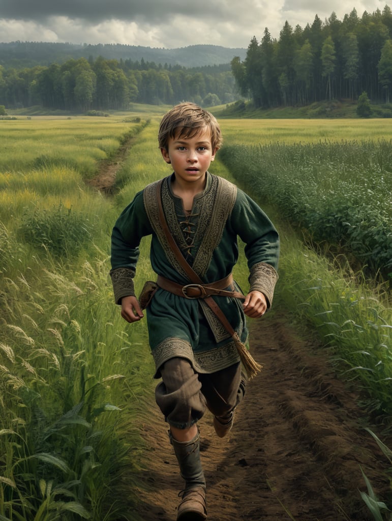 A boy aged 10 running through a field in the year 1360. Dressed in peasant clothes, with a forest in the background, overcast sky