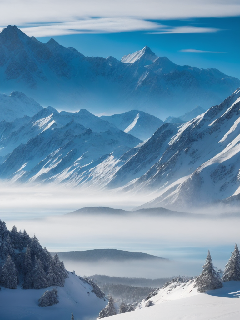 Breathtaking view of a snowy mountain range, with crisp clear air and a brilliant blue sky, serene, peaceful, majestic, high detail, winter landscape