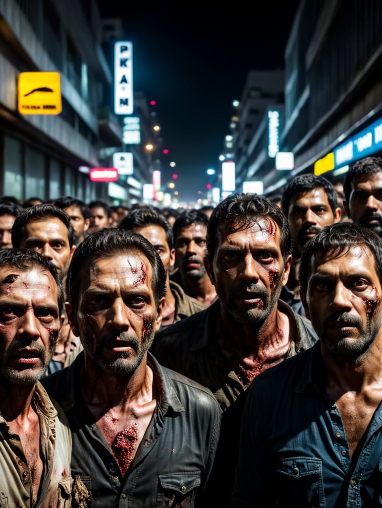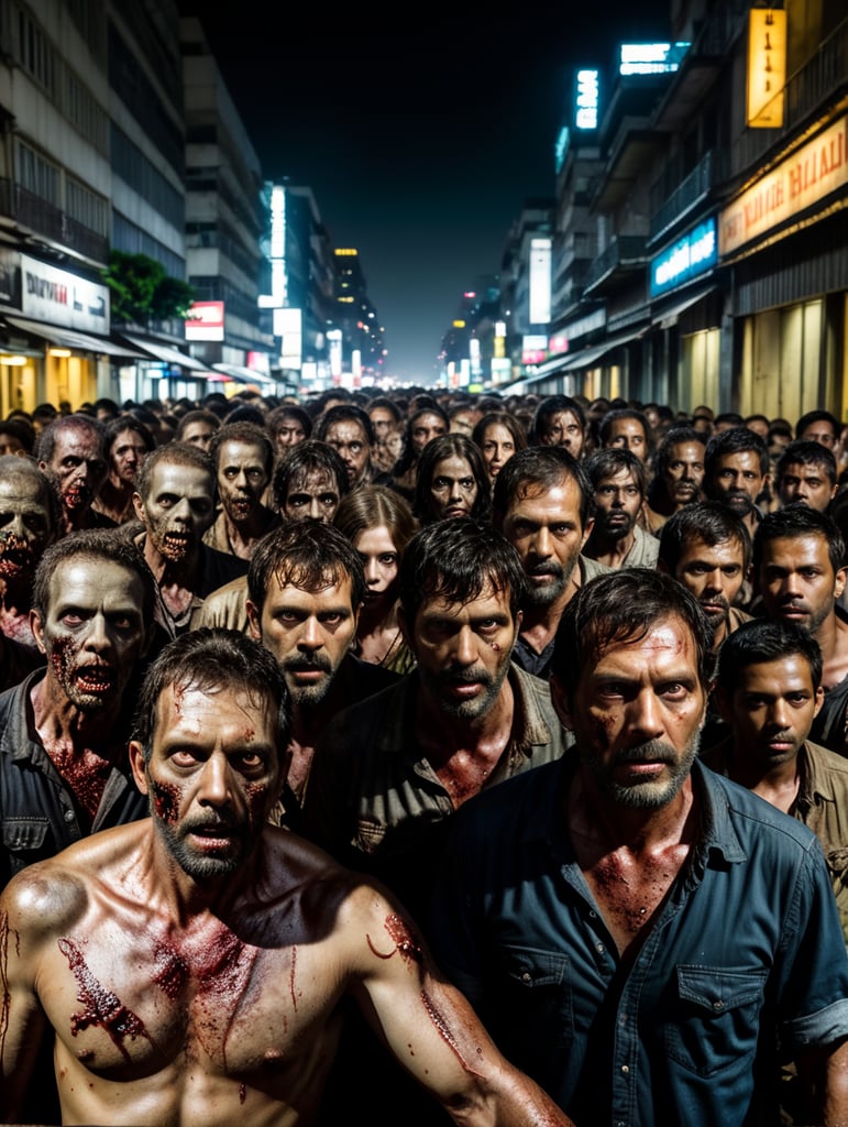 a bunch of zombies like "the walking dead" tv show in São Paulo downtwon at night, perspective