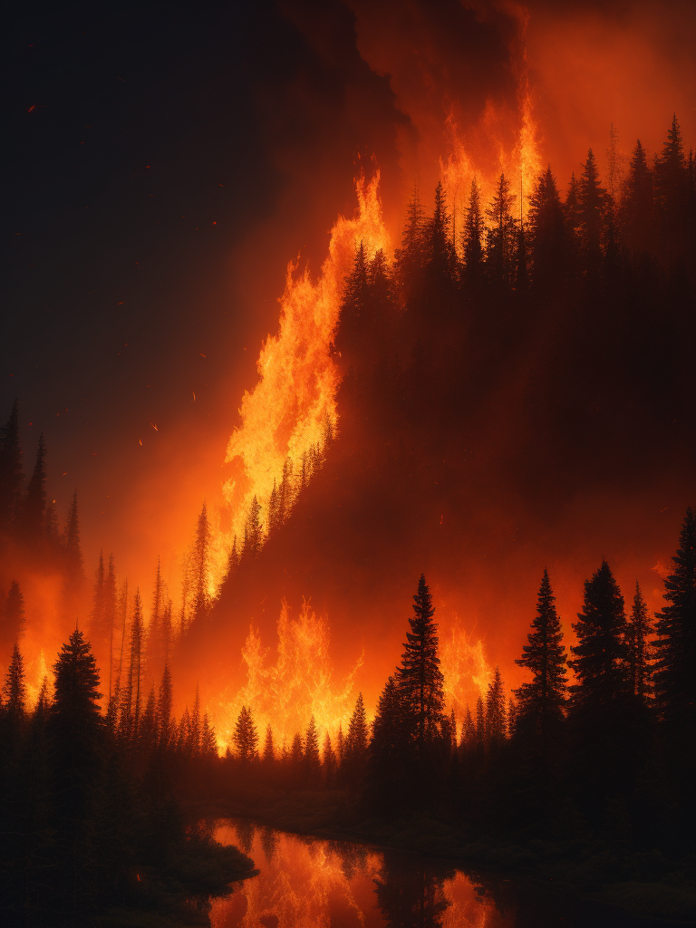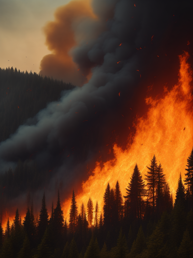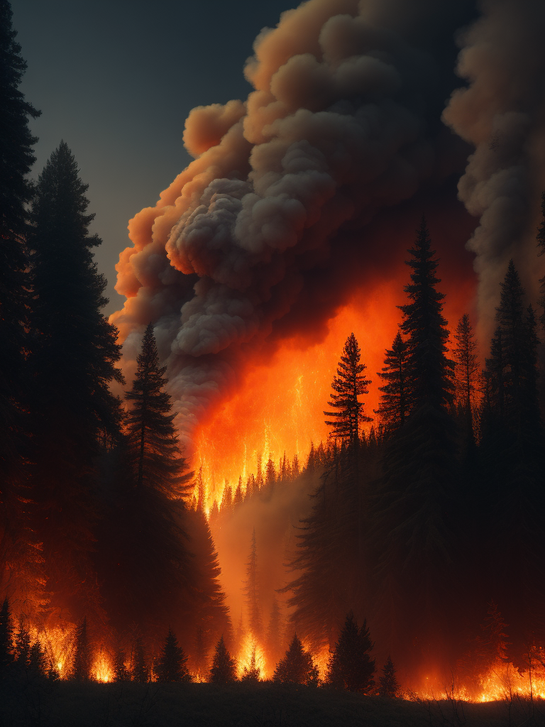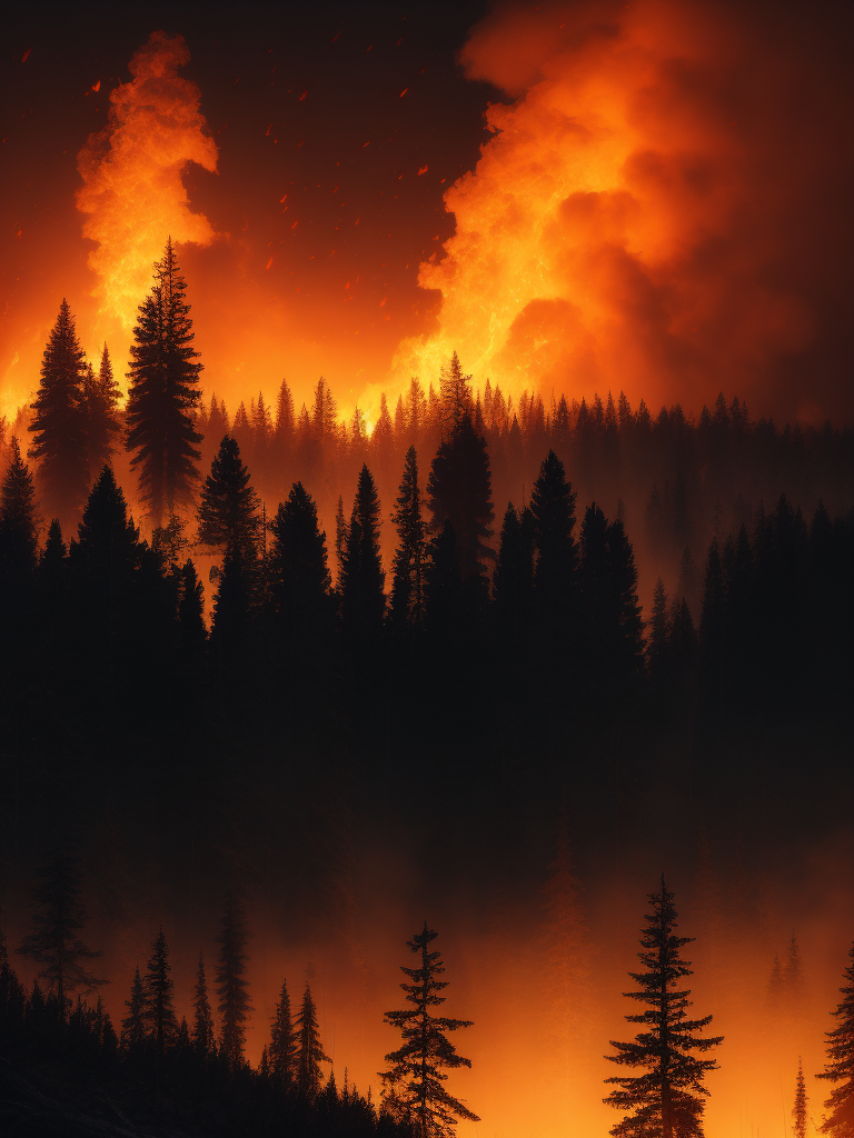 Canada wildfire 2023, Create an image depicting a vast forest landscape in Canada, with flames raging across the horizon. Show the smoke billowing into the sky, casting an ominous orange glow.https://lumenor.ai/terms-of-service/https://lumenor.ai/ai-generated-images-gallery/Z8NIfy1zs/lumenor AIlumenor AI