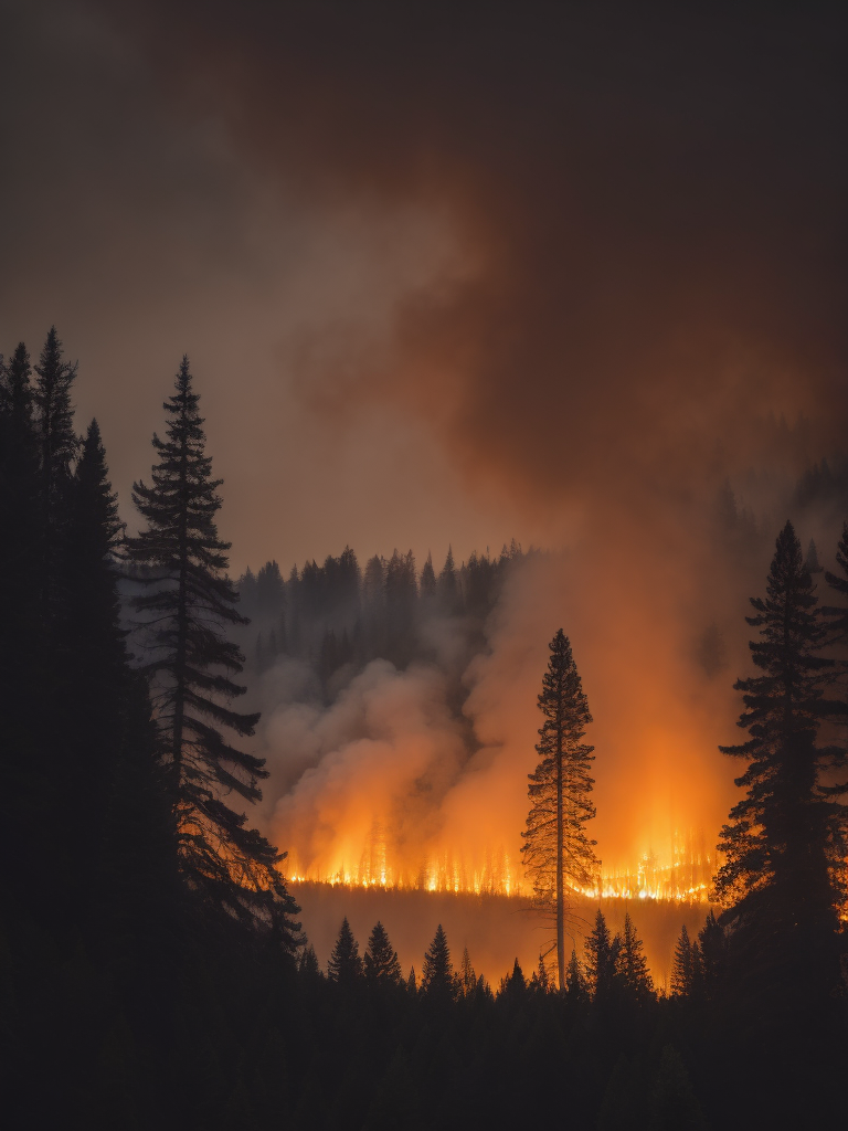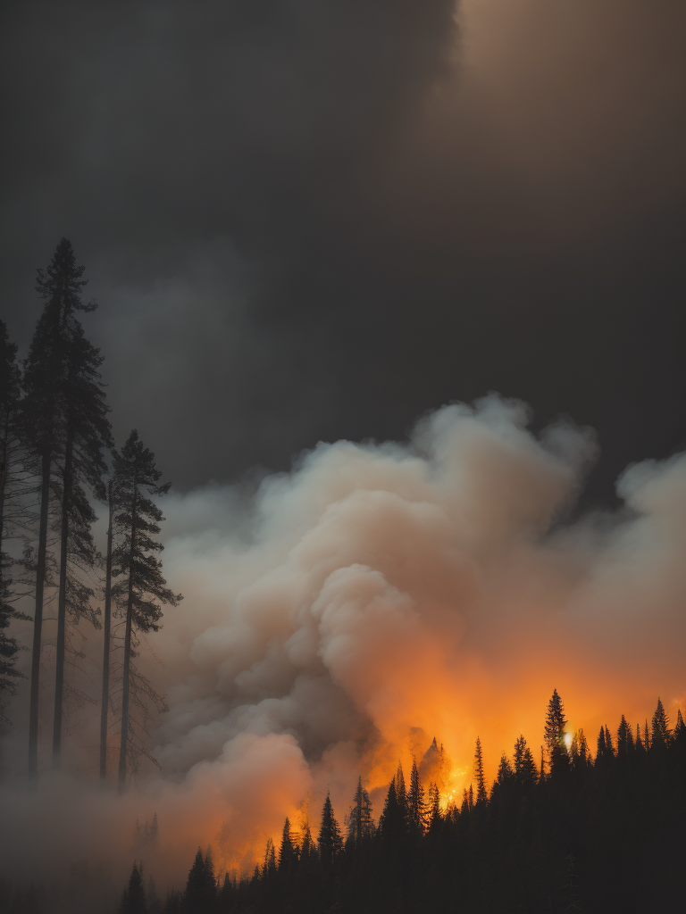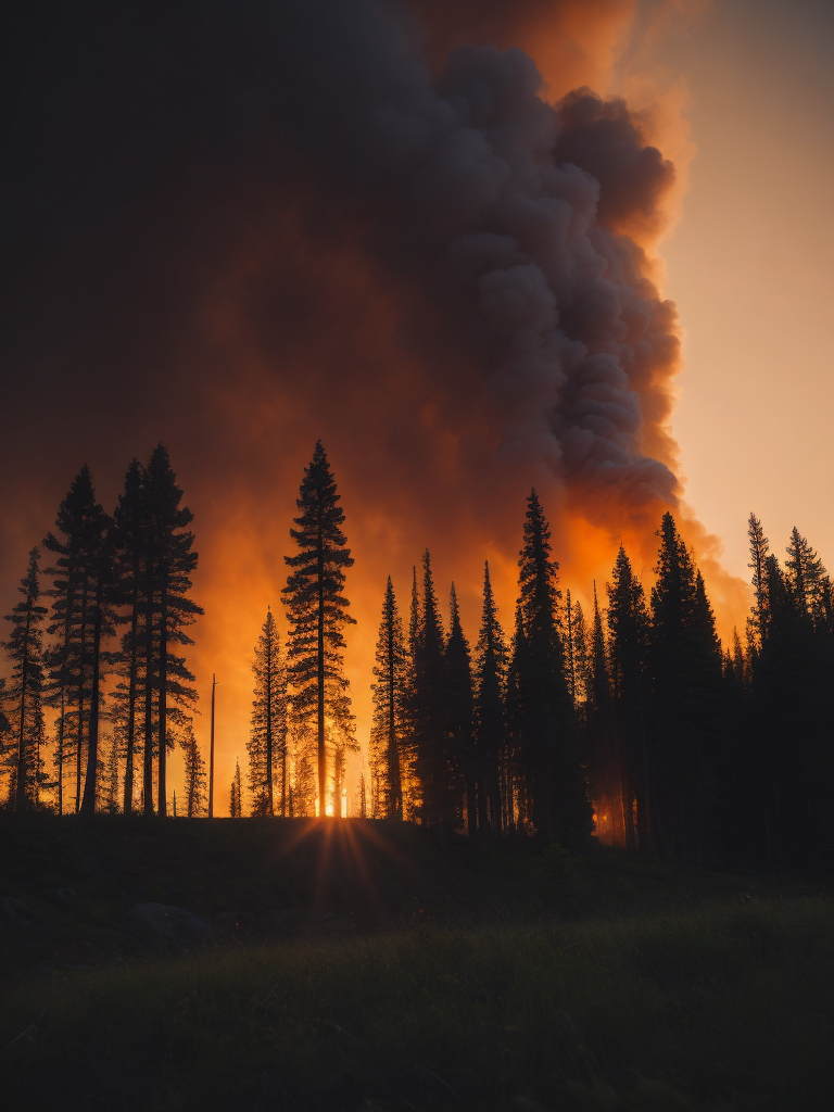 Canada wildfire 2023, Create an image depicting a vast forest landscape in Canada, with flames raging across the horizon. Show the smoke billowing into the sky, casting an ominous orange glow.https://lumenor.ai/terms-of-service/https://lumenor.ai/ai-generated-images-gallery/Z8NrmaRl9/lumenor AIlumenor AI