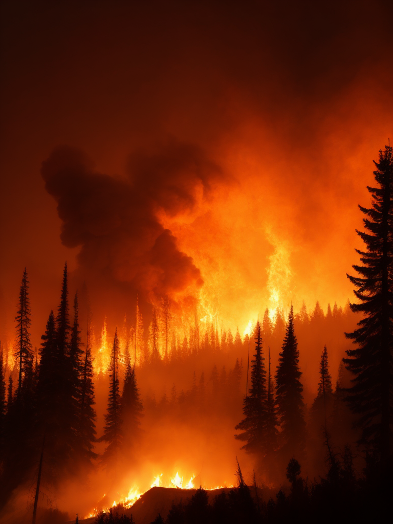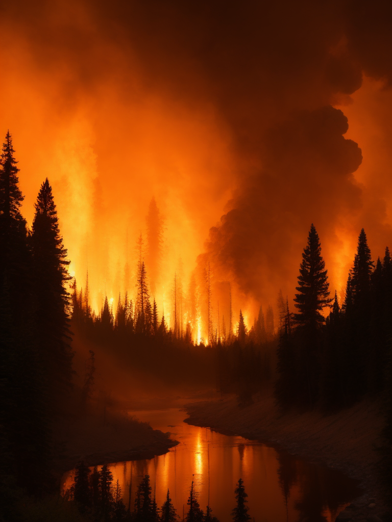 Canada wildfire 2023, Create an image depicting a vast forest landscape in Canada, with flames raging across the horizon. Show the smoke billowing into the sky, casting an ominous orange glow.https://lumenor.ai/terms-of-service/https://lumenor.ai/ai-generated-images-gallery/Z8lO7i8uv/lumenor AIlumenor AI
