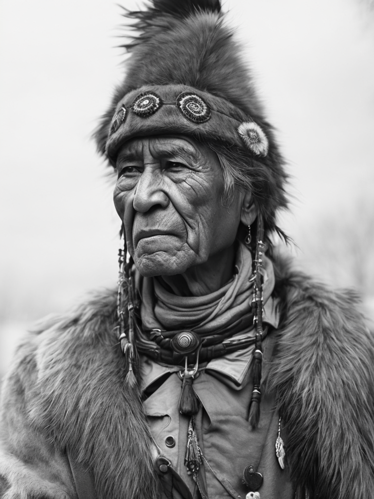 - canadian history indigenous culture first nations people historical photo black and white photography traditional clothing elderly man fur hat smoking pipe native american heritage