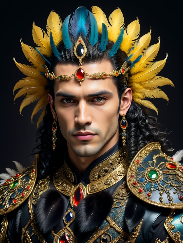 Cardan has curly, iridescent midnight hair and sharp cheekbones. He has long, black eyelashes and soft lips. His eyes are described as black with a golden ring around the pupils. He usually wears kohl under his eyes. Cardan is said to be lean and tall, with very pale skin. He has a number of scars on his back from his abusive eldest brother, Prince Balekin. Cardan possesses a slim, nearly hairless tail with a tuft of black fur at the tip which is often kept tucked away in the back of his shirt. He is described as more beautiful than the rest of the Folk by Jude. He is almost always seen wearing extravagant clothes made of opulent fabrics, studded with shiny gemstones and exotic feathers and patterns. He wears a circlet of gold on his head.https://lumenor.ai/terms-of-service/https://lumenor.ai/ai-generated-images-gallery/Zu2ZOnIo0/lumenor AIlumenor AI