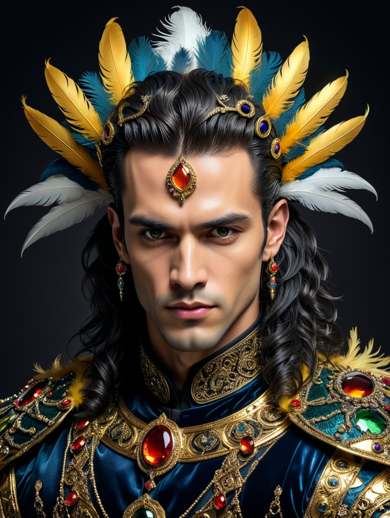 He is almost always seen wearing extravagant clothes made of opulent fabrics, studded with shiny gemstones and exotic feathers and patterns. He wears a circlet of gold on his head.