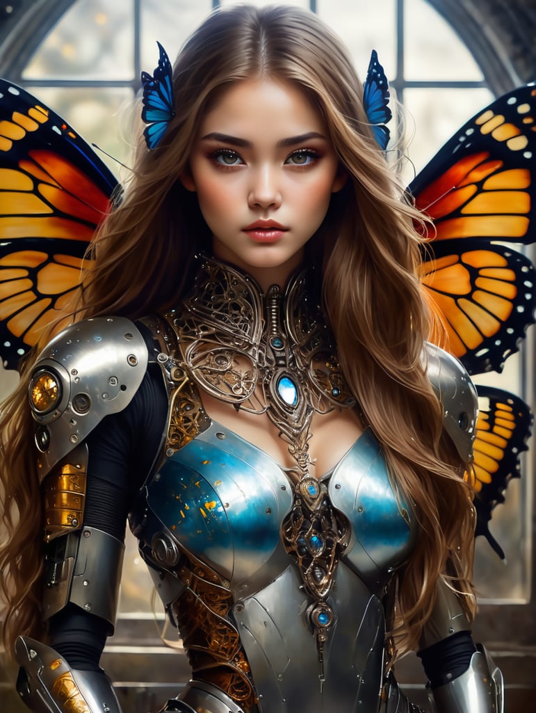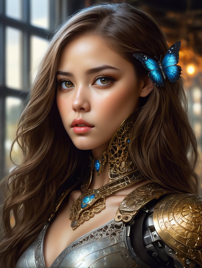 In Casey Baugh's evocative style, art of a beautiful young girl cyborg with long brown hair, futuristic, scifi, intricate, elegant, highly detailed, majestic, Baugh's brushwork infuses the painting with a unique combination of realism and abstraction, greg rutkowski, surreal gold filigree, broken glass, (masterpiece, sidelighting, finely detailed beautiful eyes: 1.2), hdr, realistic painting, natural skin, textured skin, closed mouth, crystal eyes, butterfly filigree, chest armor, eye makeup, robot joints, long hair moved by the wind, window facing to another world, Baugh's distinctive style captures the essence of the girl's enigmatic nature, inviting viewers to explore the depths of her soul, award winning arthttps://lumenor.ai/terms-of-service/https://lumenor.ai/ai-generated-images-gallery/77SPCkF7l/lumenor AIlumenor AI
