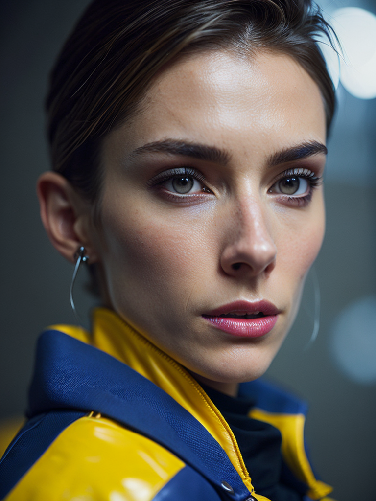 cinematic shot, a women looks on the camera, wearing yellow leather jacket, yellow lighting right side reflecting on her face, weak blue lighting left side reflecting on her face, canon 50 lens, focus on the face everything else is in blur, the blade runner scene.