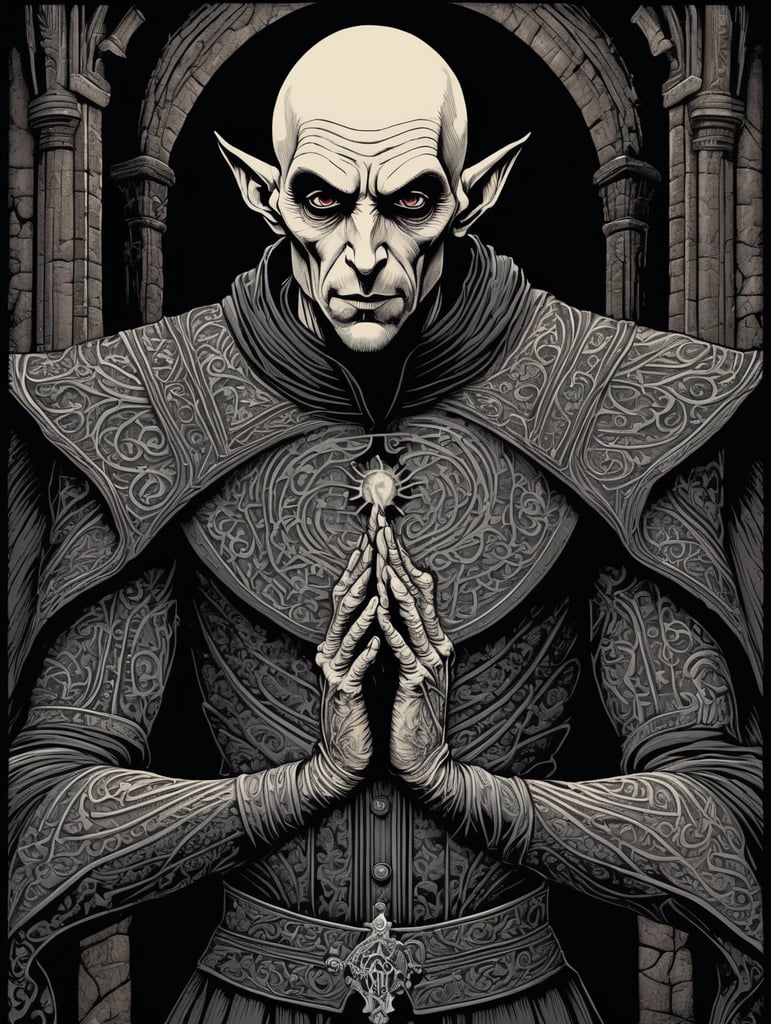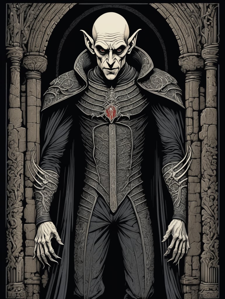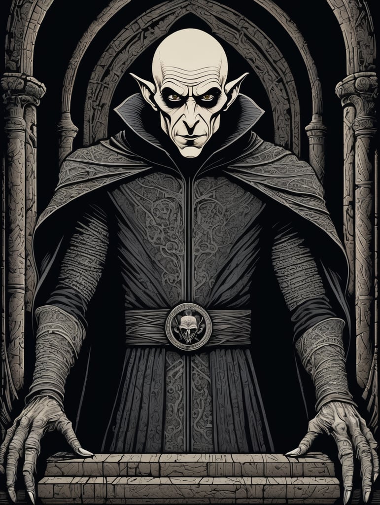 close-up of a male nosferatu with exaggerated arms, against the background of a dark dungeon setting, retro style, linocut, ink printing, in the style of linear art, black and white, high detailhttps://lumenor.ai/terms-of-service/https://lumenor.ai/ai-generated-images-gallery/Q6YiKlC4MM/lumenor AIlumenor AI