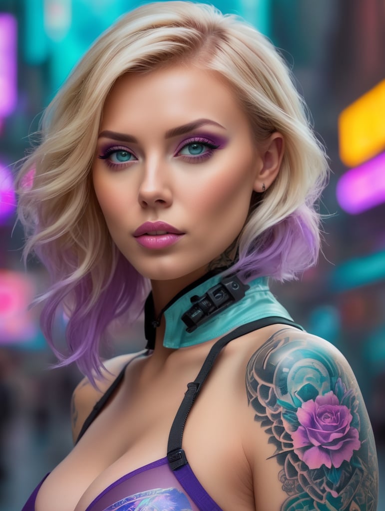 closeup portrait of a tattooed blonde girl wearing underwear and a translusent coat in neon city with tattoos, in the style of sci-fi anime painting, hdr, sergey musin, realist detail, dark cyan and purple, poolcore, 32k uhd