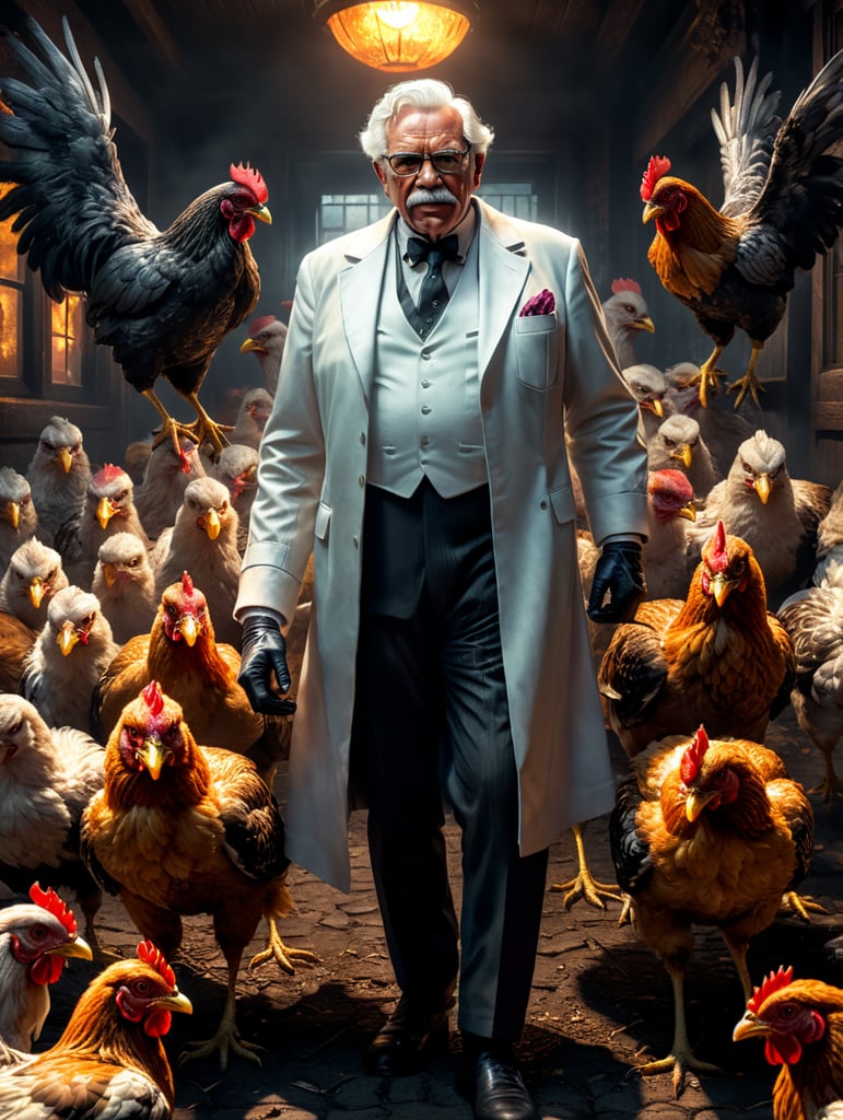 Colonel Sanders as an evil character surronded by chicken, dark and scary scene, Halloween style