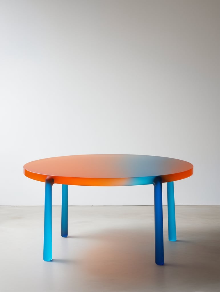 A contemporary minimalist semi-translucent silicone table with vibrant cyan blue and orange gradient colors as if designed by hi studio.