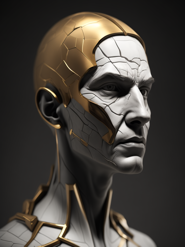 - marble sculpture cracked white marble gold interior studio lighting dark background sculpted head art textured classical
