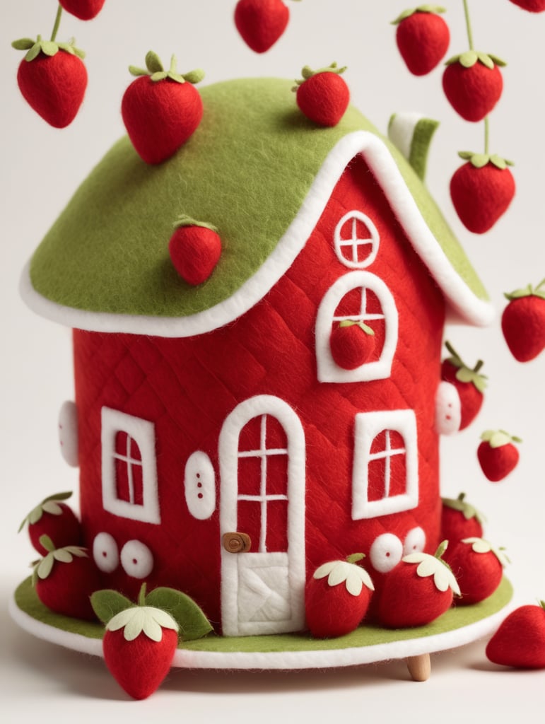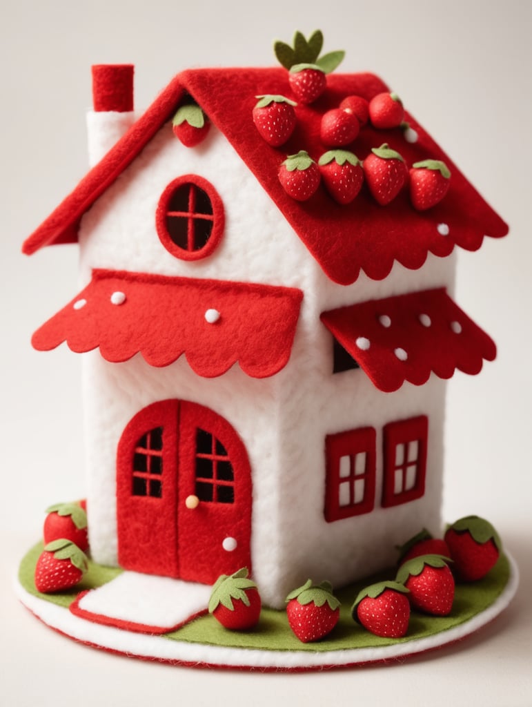 Craft Style, a house made of felt covered with strawberries and strawberry decorations, red and white, simple, round, and cute felt texture, soft edges and blurry details, clean pure white background, 4d, simplified line work, classic still life, carving, tilting, and cartoon character design rendering stylehttps://lumenor.ai/terms-of-service/https://lumenor.ai/ai-generated-images-gallery/gLdykEg9A/lumenor AIlumenor AI