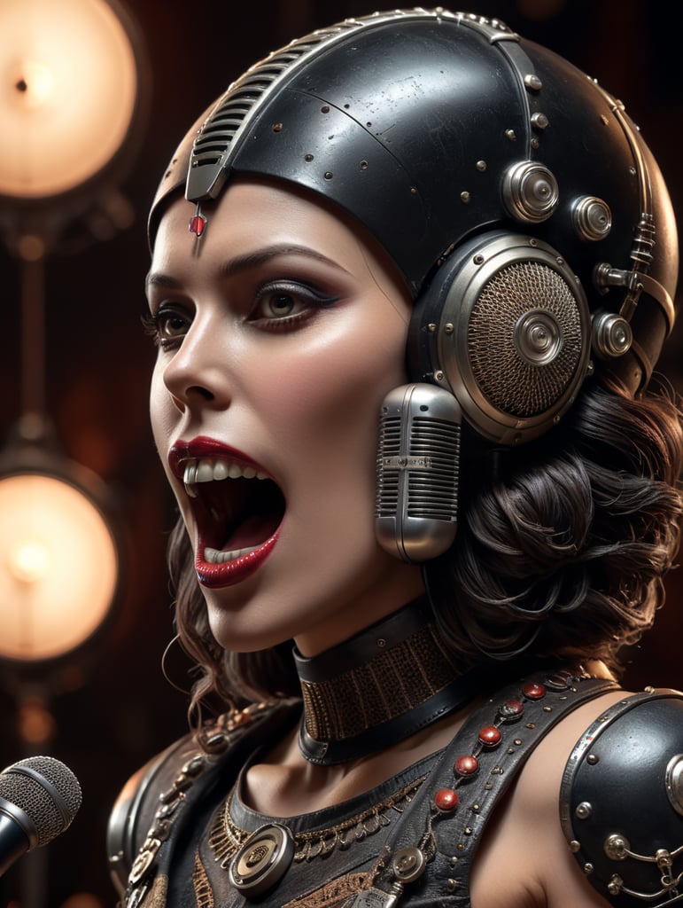 - crea un personaje con cabeza de micrófono vintage y vestido de rocker