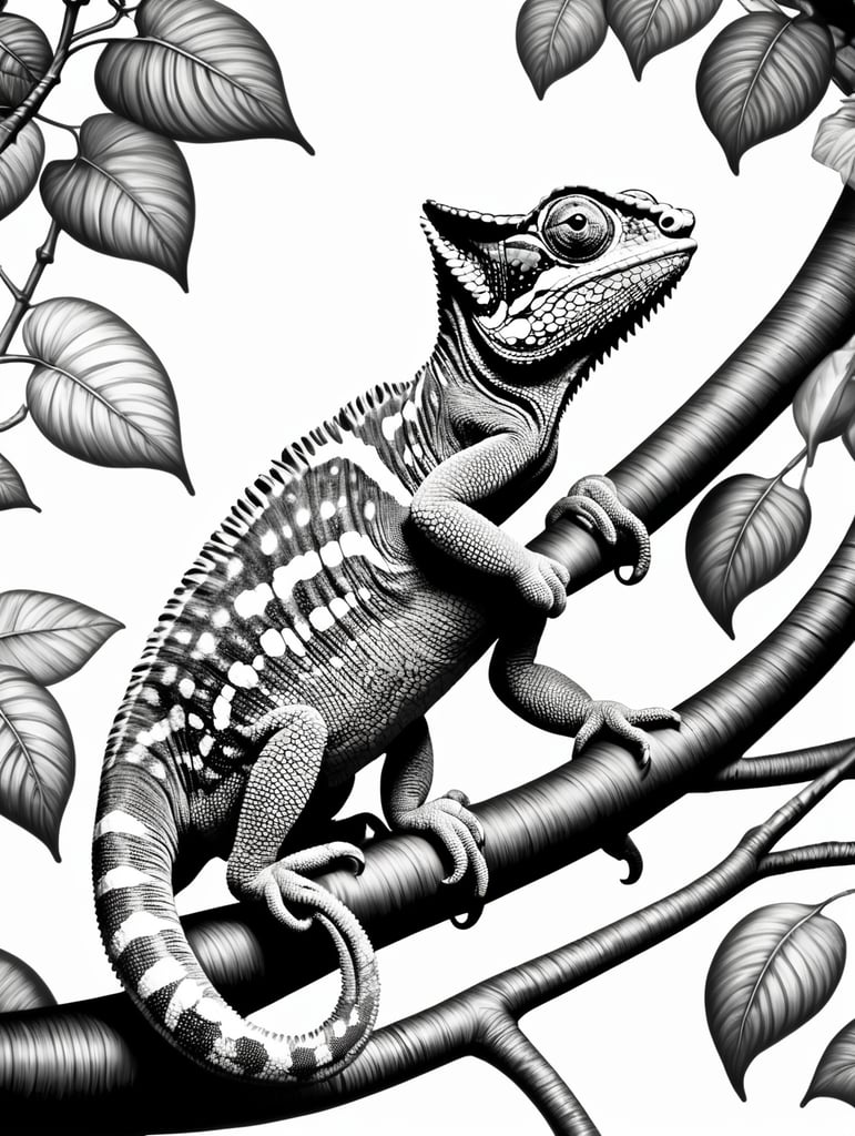 Create a cute chameleon illustration for a kids' coloring book. The chameleon should be sitting gracefully on a curving branch, its long, curled tail wrapping around the branch's edge. The chameleon's body should be slightly curved, with its eyes looking inquisitively upward. Its body can have simple, gentle curves, and its feet should delicately grip the branch. The branch itself can be winding, with a few leaves or smaller branches sprouting from it. The overall image should be simple, using clean lines and minimalistic details, perfect for kids to color easily. The final illustration should be in vector format, black and white, and exude a sense of calmness and playfulness.https://lumenor.ai/terms-of-service/https://lumenor.ai/ai-generated-images-gallery/2ajMrtqJ6/lumenor AIlumenor AI