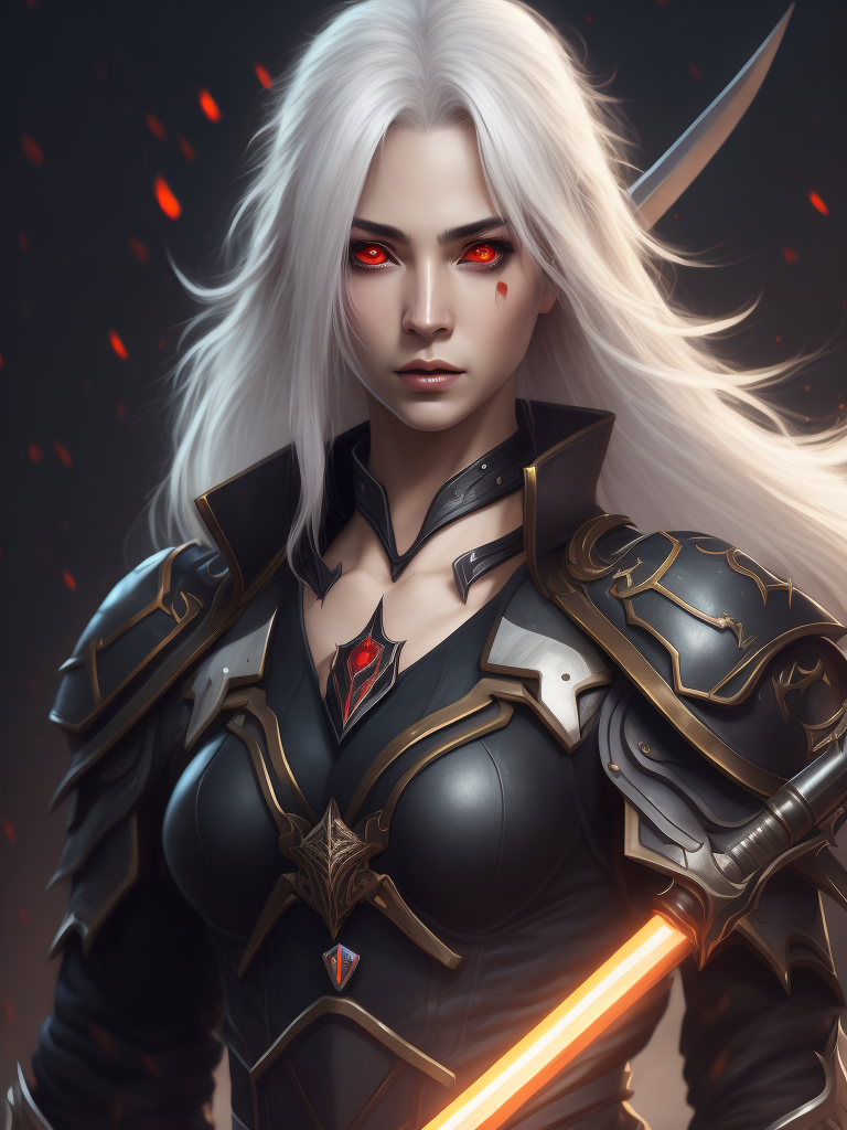 Create a digital artwork featuring an anime girl with white hair and red eyes, holding a sword