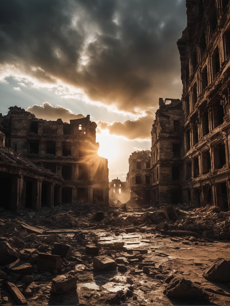 Create a dramatic image depicting the end of the world using a Sony A7VI camera aesthetic. Capture the scene of destruction and chaos with a wide-angle lens set at f/7.1 for sharp focus. Include elements such as cracked earth, ruins of buildings, dead figures emerging from graves, a colossal sun near the horizon, and a sense of divine judgment, all illuminated with cinematic lighting