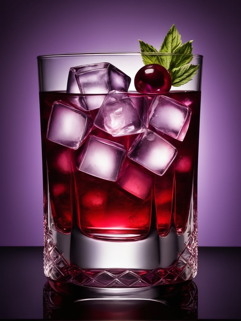 "Create a hyper-realistic image of a cocktail in a rocks glass. the cocktail is a harmonious blend of sour, sweet, and berry flavors in a deep, rich purple or reddish hue.