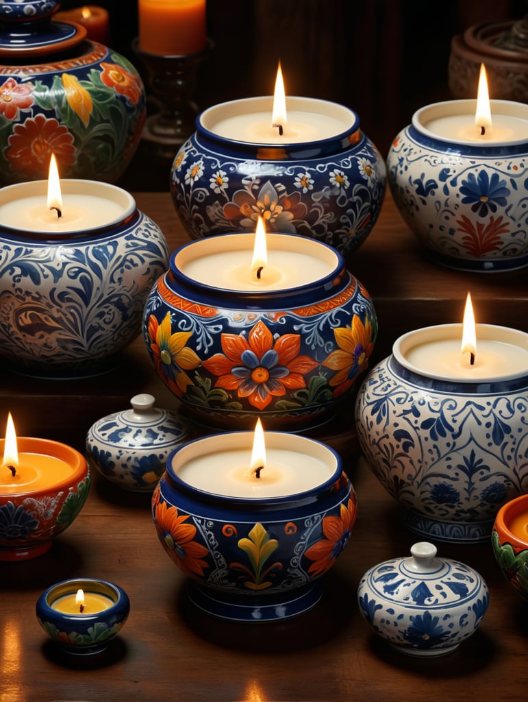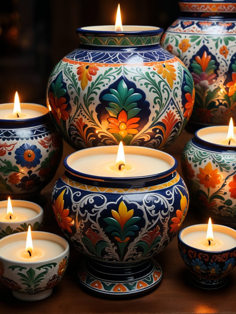 - isabel's arte velas candle collection mexican art mexican culture talavera pottery hand painted vessel intricate patterns luxury white vessels candle display art inspired candles