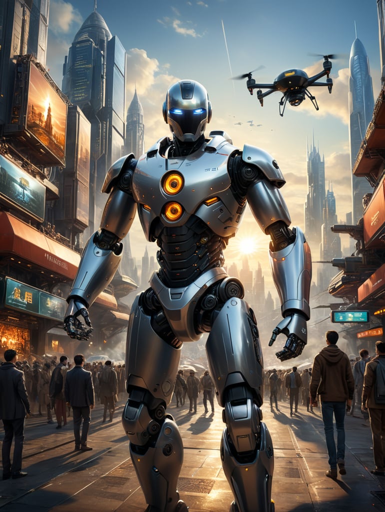 Image description: The image depicts a futuristic scene where robots and humans coexist in harmony. In the center of the image stands a humanoid robot, with its metallic body gleaming in the sunlight. The robot's eyes are glowing with artificial intelligence, and its pose exudes confidence and power. In the background, we can see a city bustling with activity, where autonomous cars and drones are transporting people and goods across the urban landscape. The overall vibe is one of excitement and optimism for the possibilities of AI.