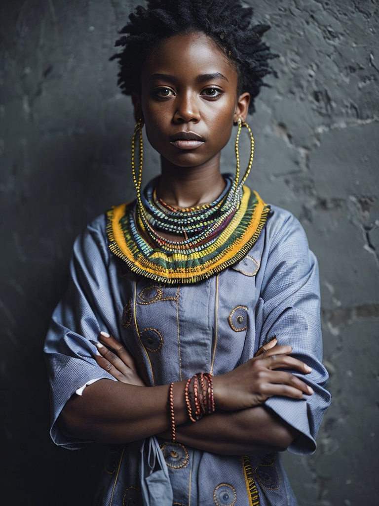 Create a manga drawing of a young African character wearing modernized traditional clothing, standing confidently with arms crossed.https://lumenor.ai/terms-of-service/https://lumenor.ai/ai-generated-images-gallery/GpwwBy94H/lumenor AIlumenor AI